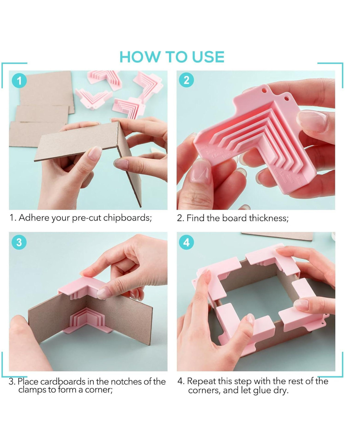 - [CÓMO USAR]--Coloca tu cartón precortado en las muescas de la pieza de esquina, de modo que forme una esquina. Coloca la otra pieza de esquina en el otro extremo del cartón y repite este paso con el resto de las esquinas.