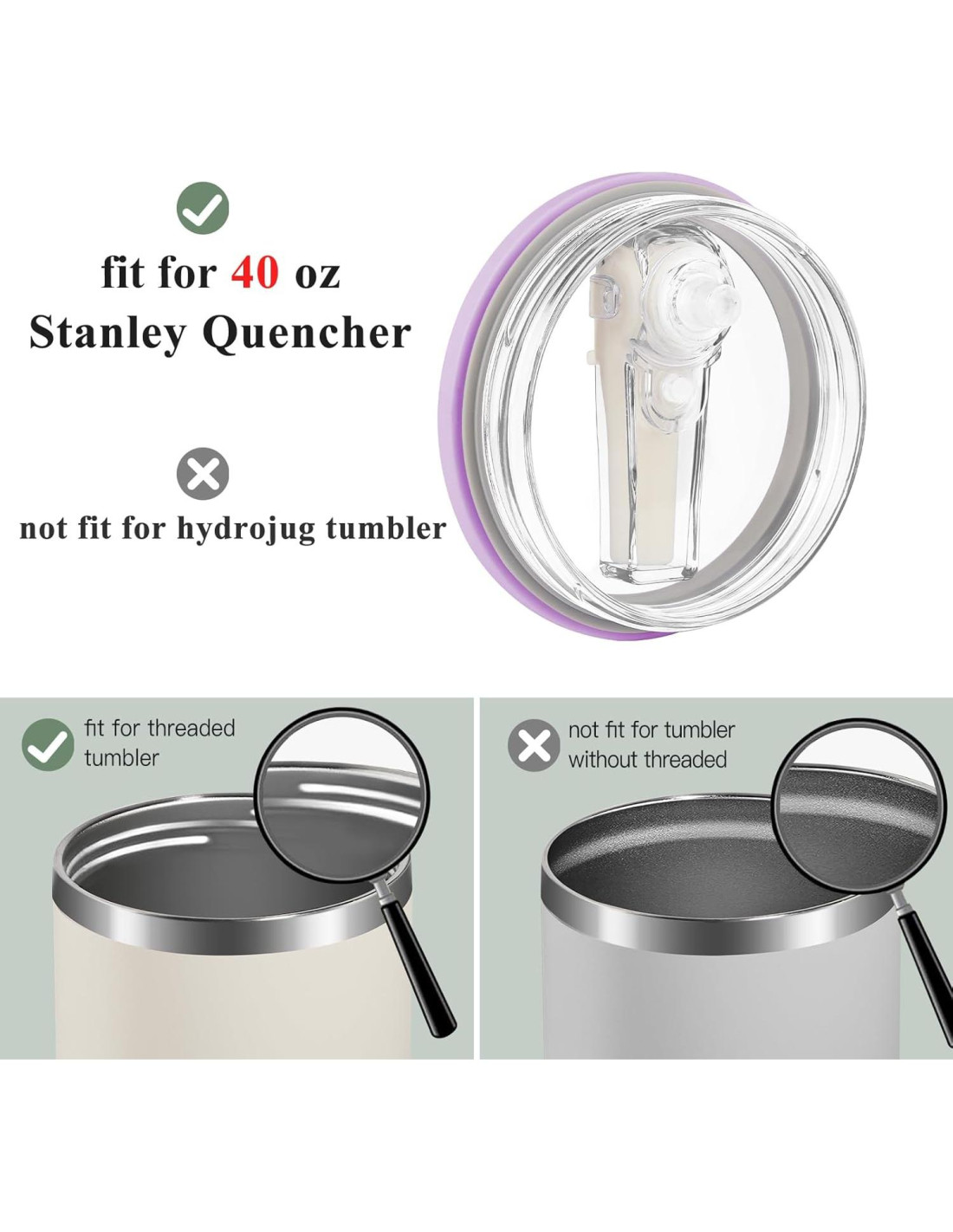 - [Solo se adapta a Tumbler de 40 oz Stanley] Específicamente diseñado para el tumbler Stanley de 40 oz Quencher. Para tumbler de 30 oz u otras marcas de tumblers, debido a problemas de tamaño, la tapa y tu tumbler pueden no encajar correctamente.