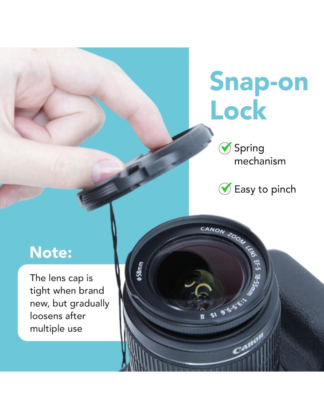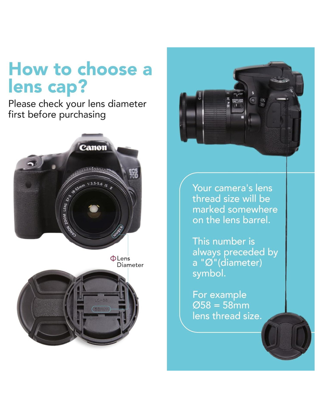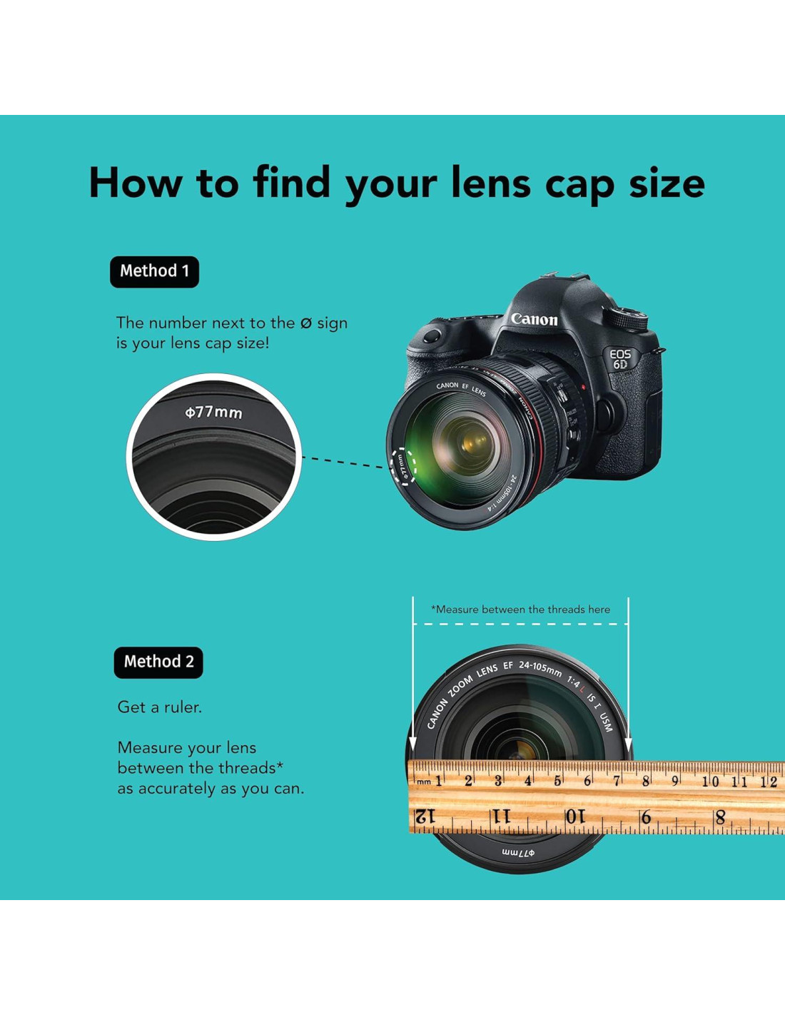 - UNIVERSALMENTE COMPATIBLE. Compatible con la mayoría de las marcas de cámaras DSLR. Nuestro accesorio de tapa de lente está disponible en diferentes tamaños. Por favor, mide el tamaño de tu lente antes de comprar.