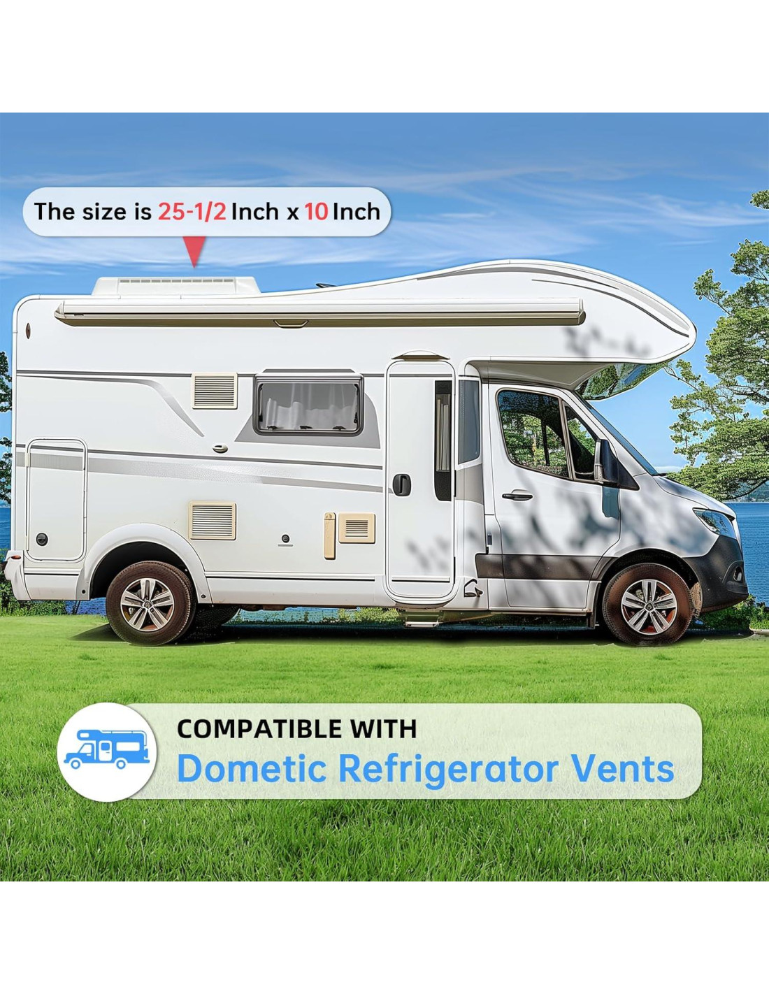 - Compatibilidad: La Tapa de Ventilación de Refrigerador es Compatible con Ventilaciones de Refrigerador Dometic. El tamaño es 25-1/2 pulgadas (64,77 cm) x 10 pulgadas (25,4 cm)