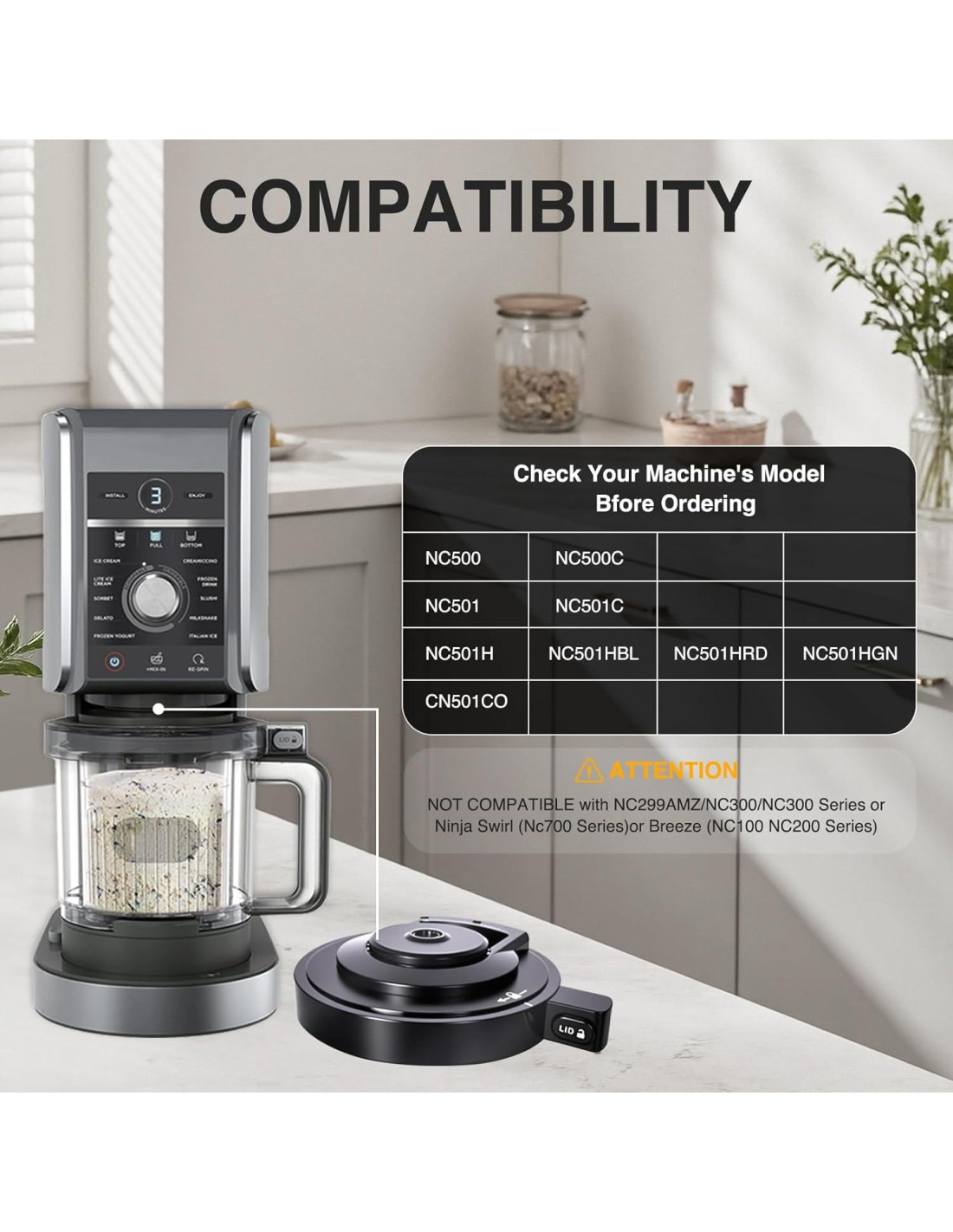 - COMPATIBILIDAD SIN COSTURAS Esta tapa de tazón exterior de reemplazo está diseñada específicamente para modelos Ninja COMPATIBLES con Ninja Deluxe NC500, NC501, NC501H, NC501HBL, NC501HGN y CN501CO. NO (Serie NC300) Máquinas de Helado o Ninja Swirl (Serie NC700) o Breeze (Serie NC100NC200)