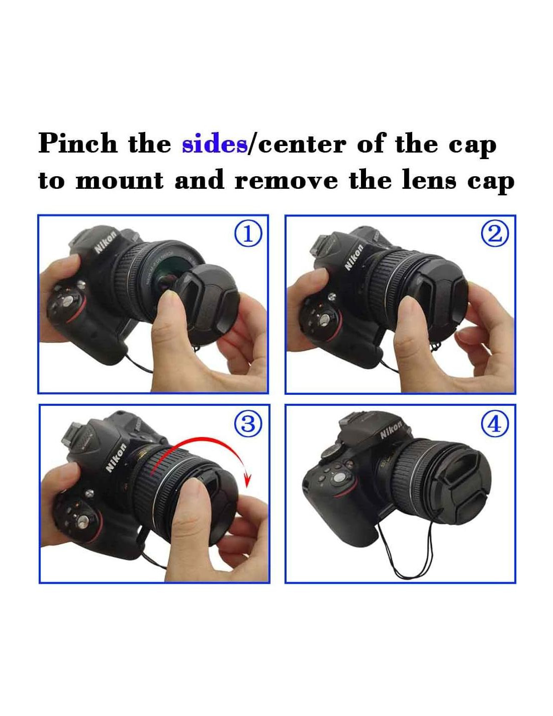 - Pellizque los lados de la tapa y colóquela en su lugar. Incluye sujetador de tapa de lente para evitar pérdidas.