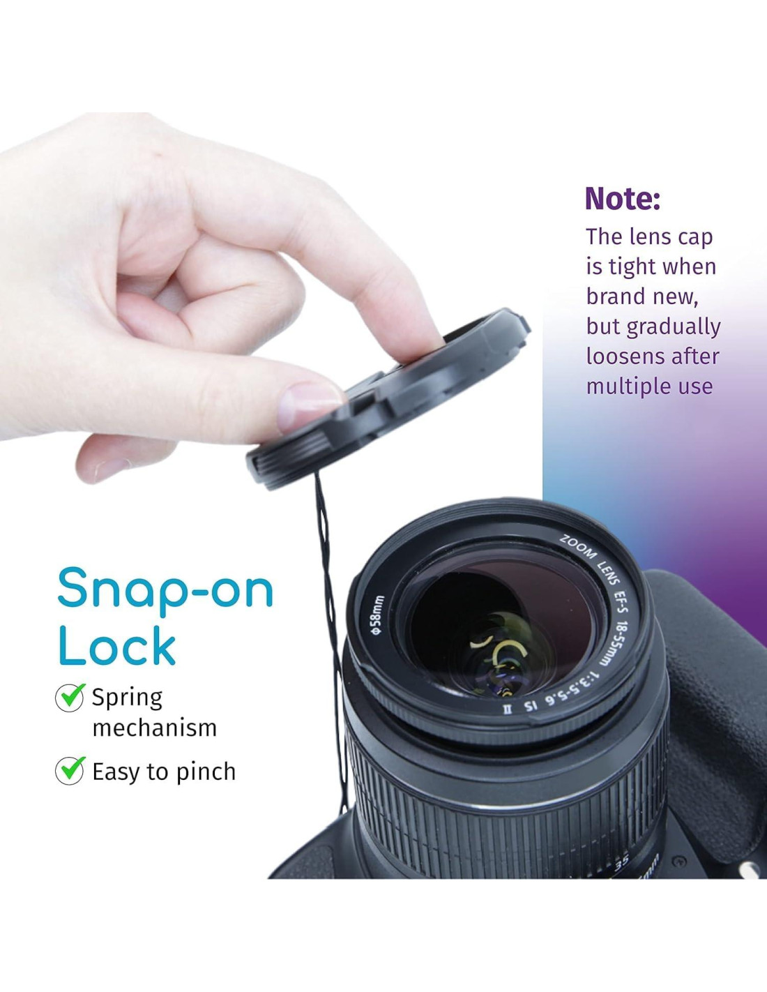 - Se ajusta de manera ceñida y segura a la lente, se sujeta a una banda elástica
