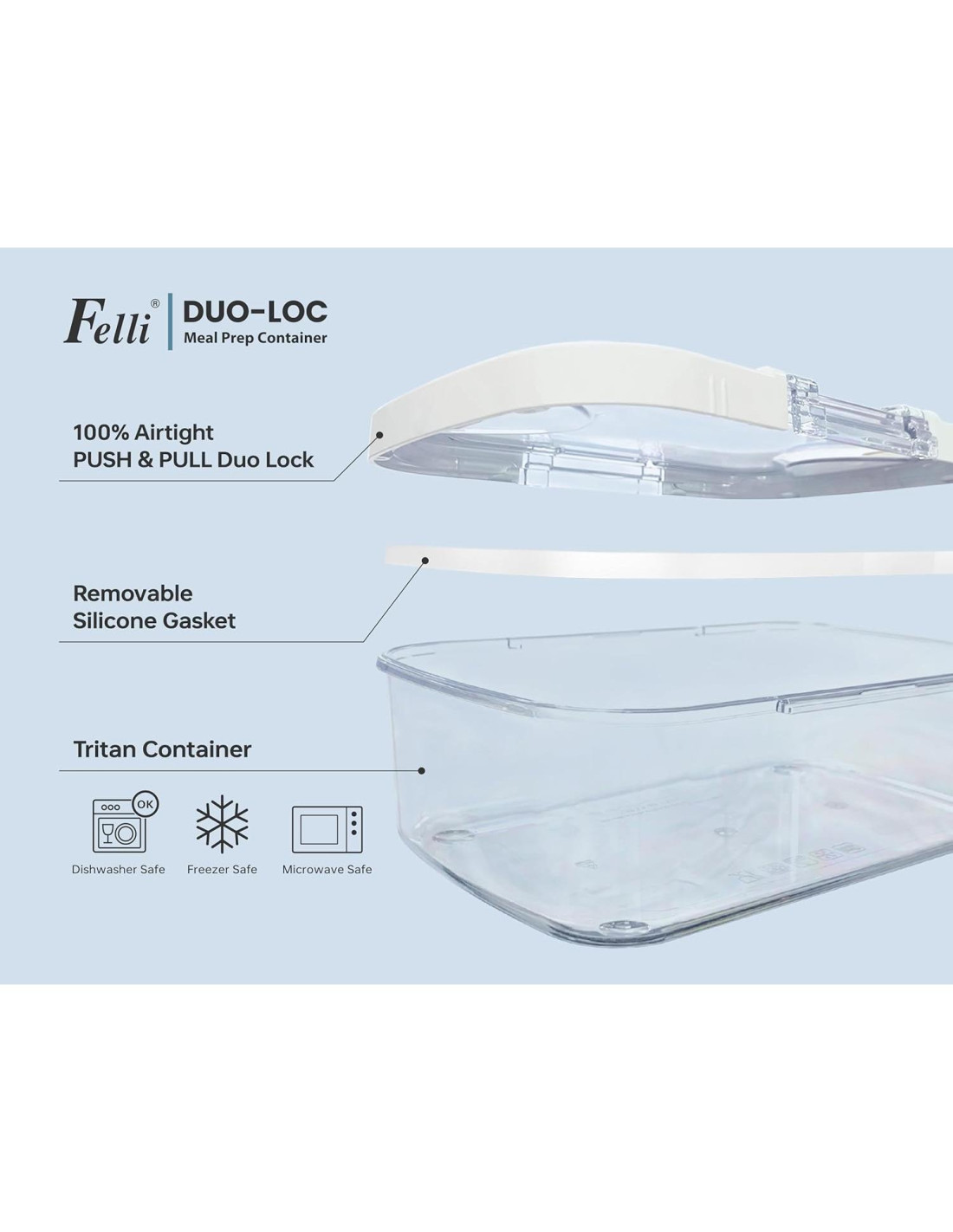 - 100% A PRUEBA DE FUGAS Y DURADERO: Los contenedores de preparación de comidas Felli Duo Loc son 100% a prueba de fugas, con un sello de silicona hermético. Hechos de material de Tritan de primera calidad, ofrecen una durabilidad superior en comparación con los plásticos tradicionales, reduciendo significativamente el riesgo de grietas y roturas con el tiempo. Apto para microondas y a prueba de roturas, con claridad similar al vidrio que lo convierte en una alternativa segura y duradera tanto a los plásticos tradicionales como a los contenedores de almacenamiento de alimentos de vidrio.