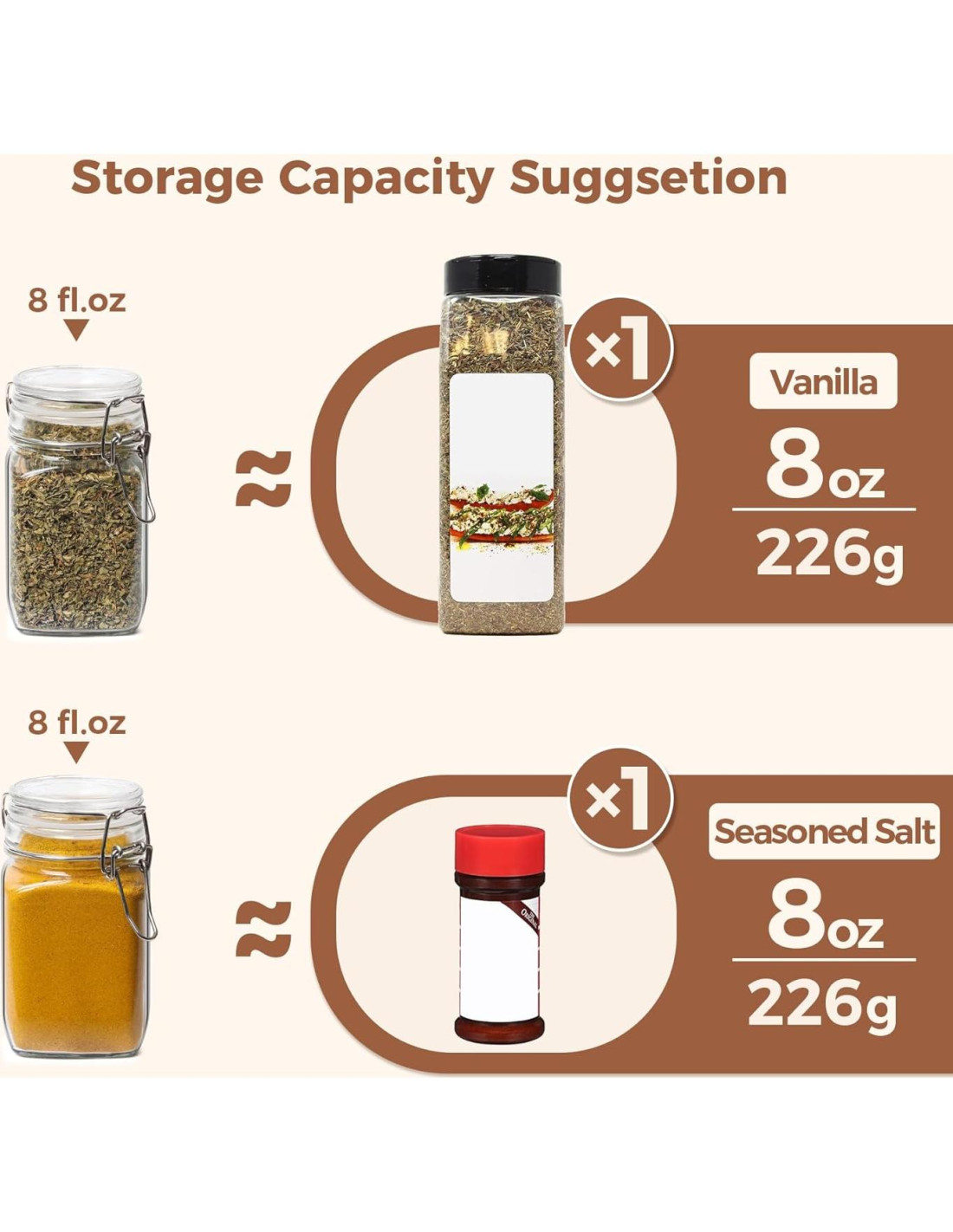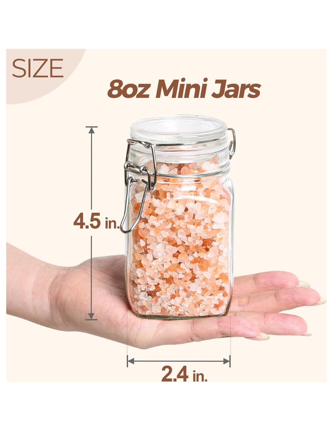 - Almacenamiento de porciones inteligente: Estos tarros de vidrio de 8 oz con tapas son ideales para porcionar alimentos como nueces, hierbas, sales o aderezos caseros. Su pequeño tamaño ahorra espacio, lo que los hace fáciles de almacenar, organizar y empacar bocadillos o golosinas para llevar