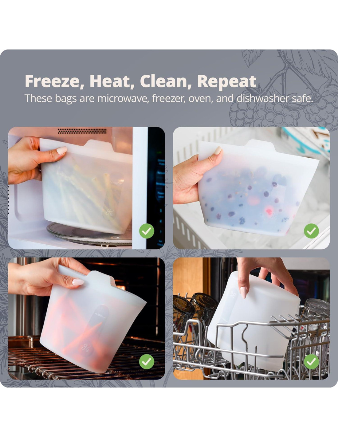 - Mejor para Almacenamiento: Las bolsas de silicona se mantienen y permanecen abiertas por sí solas, por lo que son fáciles de llenar. Luego, se sellan herméticamente gracias a su cremallera de triple labio patentada y permanecen cerradas para que las bolsas reutilizables para congelador no se derramen y hagan un desastre.