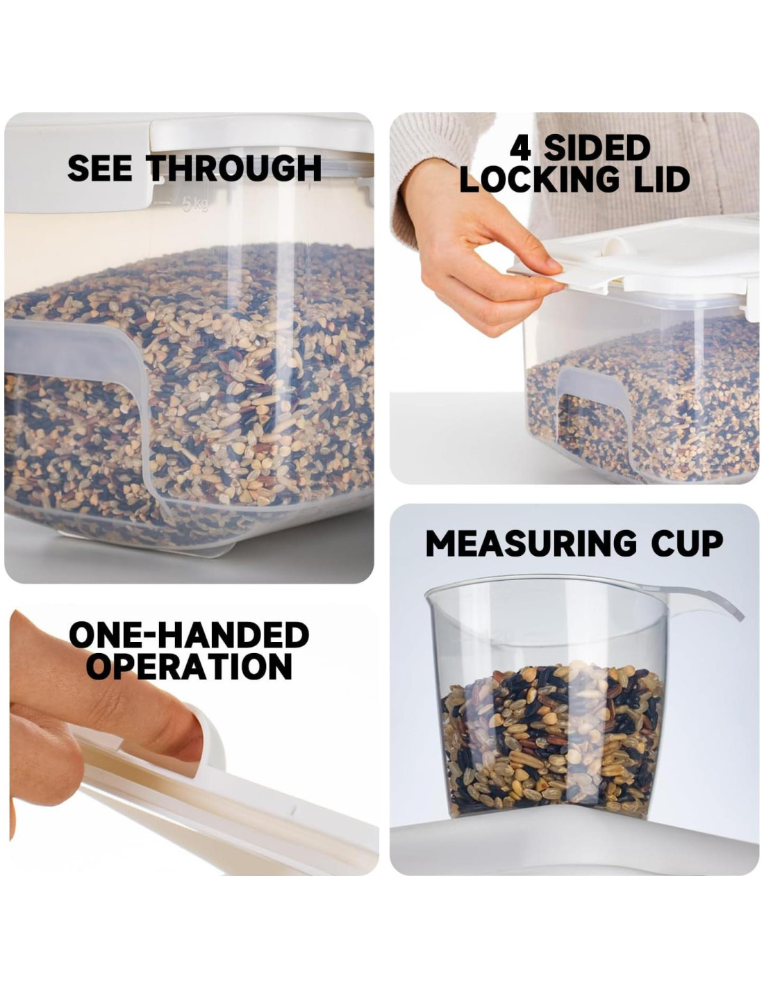 - Componentes incluidos: Contenedor de Almacenamiento de Arroz de 10 kg, Taza Medidora, Tapa, Ruedas Rodantes
