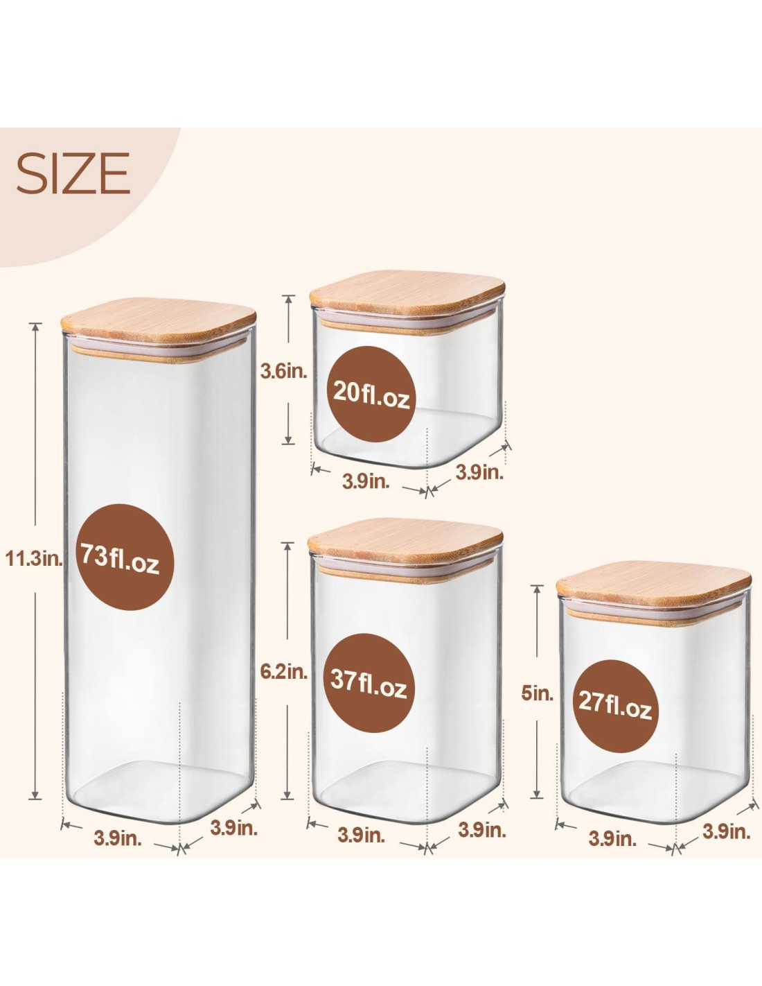 - Tarros de Cocina Transparentes: Mejora la organización de tu cocina con nuestros contenedores de vidrio cuadrados, que cuentan con un diseño transparente; el vidrio transparente permite un monitoreo sin esfuerzo de los niveles de alimentos, lo que te permite rastrear el uso y evaluar la condición del almacenamiento de alimentos