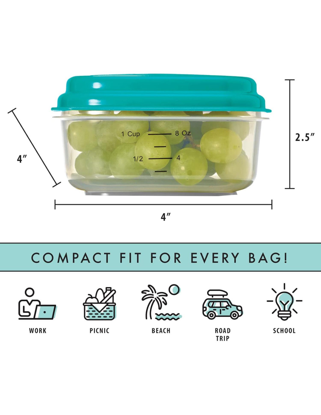 - FÁCIL PREPARACIÓN DE COMIDAS - 4 Contenedores de plástico que miden 1 taza (8 oz) con líneas de medición para conveniencia. Perfectos para empacar bocadillos y comidas con precisión.