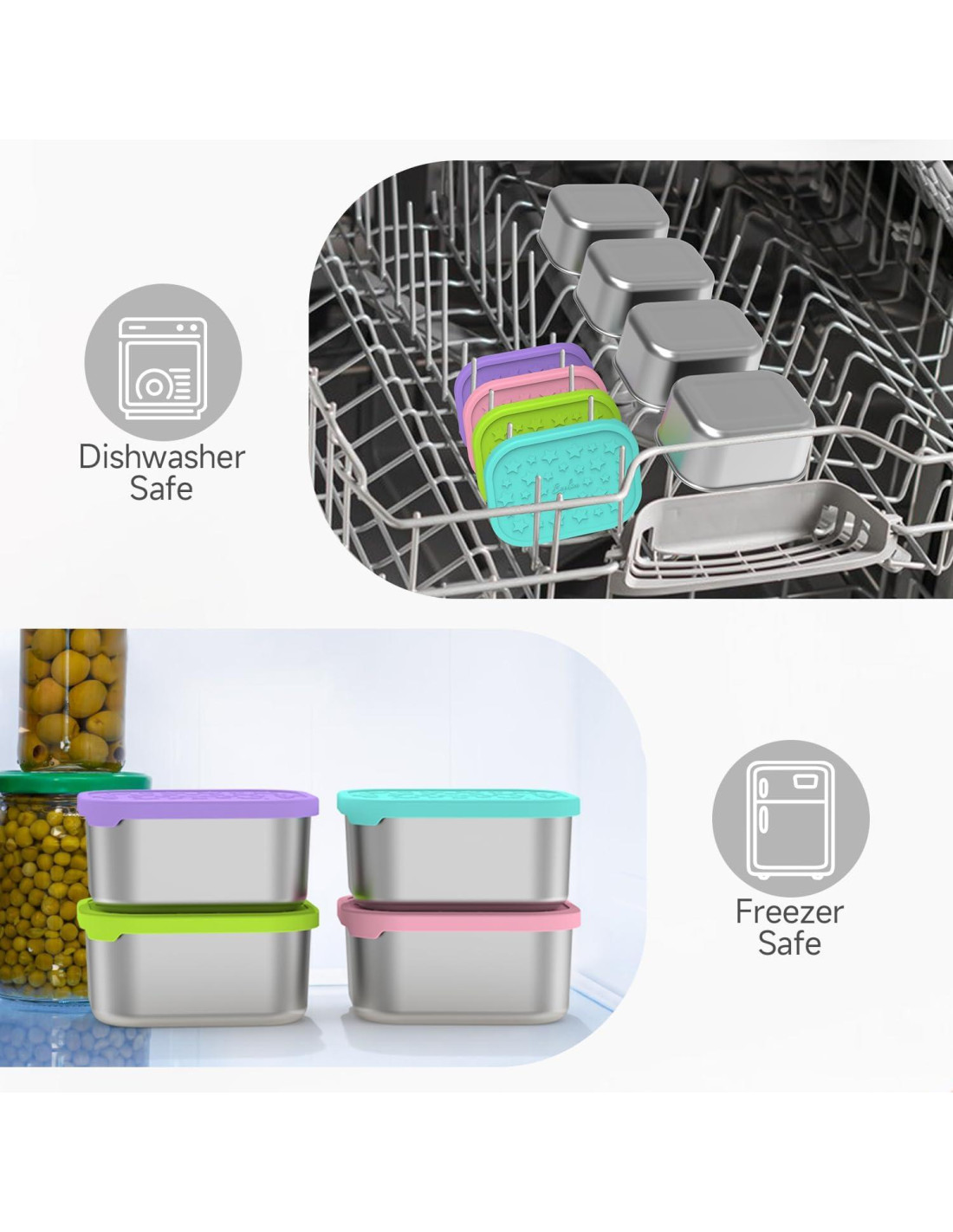 - Diseño Amigable para Niños: Los patrones lindos y colores vivos aumentarán el apetito de tu hijo. Los diferentes colores también ayudan a los niños a desarrollar la coordinación mano-ojo, la fruta va en un color y los frutos secos en otro. La combinación de la tapa de silicona suave y el mango es fácil para que los niños abran. Es genial para niños independientes. Los contenedores premium para niños están hechos de material aprobado para alimentos y son seguros para los miembros de tu familia y el medio ambiente.