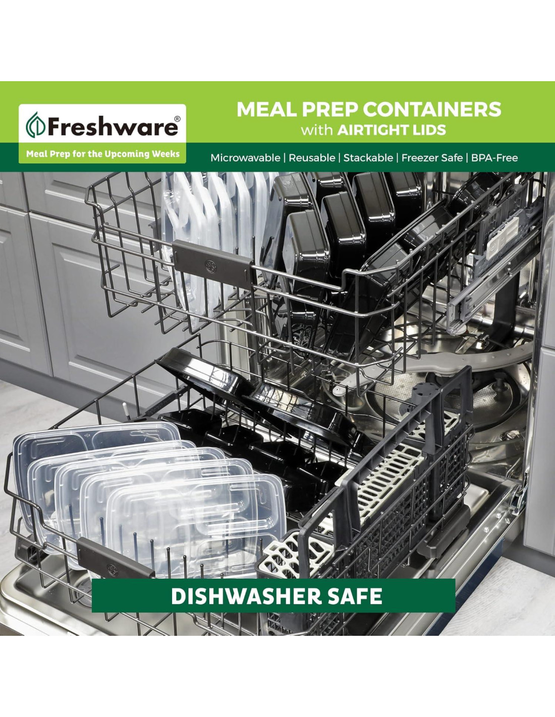 MANTENTE EN FORMA Y SALUDABLE- Disfruta de deliciosas comidas caseras en todas partes con los contenedores de preparación de comidas número 1 de Freshware! ¿Estás cansado de gastar dinero en comprar comida poco saludable ya preparada? Conoce las cajas bento definitivas, ¡tu nuevo mejor amigo en la cocina! Con 3 compartimentos espaciosos de diferentes tamaños, puedes usar este conjunto de 50 cajas de almuerzo inteligentes para varios bocadillos sin que se mezclen. ¡Tu comida se verá y sabrá genial todo el día! Proporciona a ti y a tu familia una comida decente de porciones controladas con plato principal, ensalada e incluso postre, todo bien empaquetado en esta súper conveniente caja de almuerzo! Calidad suprema y diseño reflexivo combinados! Hechos exclusivamente de polipropileno 100% seguro para alimentos, libre de BPA, PVC y ftalatos, estos contenedores de plástico reutilizables son la opción más segura que puedes hacer. Gracias a su calidad inigualable puedes: Preparar más comidas con anticipación y congelarlas para los días ocupados cuando no tendrás tiempo para cocinar. Calentarlos en el microondas para disfrutar de una deliciosa comida caliente. Limpiarlos sin complicaciones en el lavavajillas! Tamaño de la caja: 22.86 x 17.27 x 3.81 cm. Tamaño del compartimento grande: 14.73 x 10.16 x 3.81 cm. Tamaño de los dos compartimentos pequeños: 10.16 x 7.11 x 3.81 cm. Volumen: 340, 170 y 170 ml, Total 680 ml. Tamaño de la tapa: 22.86 x 17.27 x 1.52 cm. Paquete de 50 tapas herméticas y contenedores de frescura. Estos contenedores de almacenamiento de alimentos para preparación de comidas son una gran nueva alternativa a los costosos contenedores de plástico. Perfectos para la caja de almuerzo de adultos, caja de comida para el trabajo, mientras que son altamente recomendados por la mayoría de los expertos en fitness para cajas bento de preparación de comidas. OBTENLO CON CONFIANZA: Freshware te ofrece su política de reemplazo o reembolso GRATIS. ¡Esa es nuestra promesa! Comencemos tu estilo de vida saludable agregando los MEJORES contenedores de preparación de comidas de FRESHWARE a tu carrito HOY!