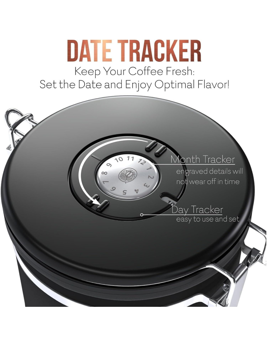 - Rastreador de Fecha Integrado para Máxima Frescura - ¡Nunca olvides cuándo almacenaste tu café! El dial de fecha integrado te permite rastrear el tiempo de almacenamiento, asegurando que cada preparación esté en su punto máximo de sabor.