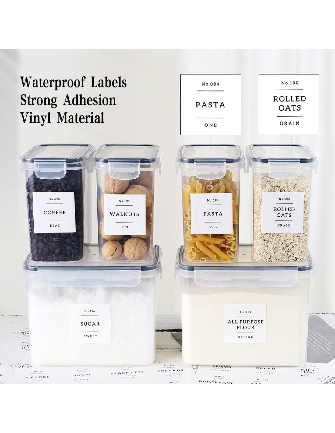 - ETIQUETAS DE ALACENA PERFECTAS 132 etiquetas de alacena de cocina para contenedores de almacenamiento de cocina para mantener tu comida fresca y la alacena ordenada. Las etiquetas minimalistas son texto negro sobre etiquetas de comida blancas adecuadas para todos los contenedores de harina con tapas herméticas. Las etiquetas de organización de calcomanías de alacena están preimpresas en etiquetas de vinilo impermeables de primera calidad que no se rasgarán ni despegarán, pero se pueden quitar fácilmente.