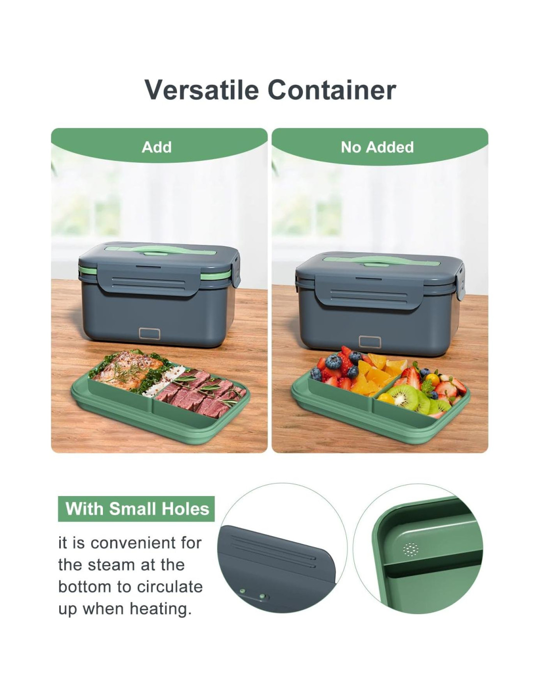 - Propiedades Más Fuertes a Prueba de Fugas - La tapa de la caja de almuerzo eléctrica tiene pestillos en los cuatro lados, y su área de cobertura está diseñada para ser más grande, haciéndola más fuerte y no se rompe fácilmente. Y el anillo de sellado de goma incorporado puede asegurar que la comida no se filtrará durante el transporte y mantendrá la comida fresca. ¡No necesitas preocuparte por derrames de comida, incluso en un entorno de coche inestable!