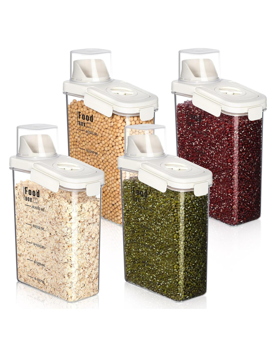 - Diseño de Salida en Embudo: el almacenamiento de los contenedores tiene un diseño de mango, lo que facilita y agiliza su uso; Nuestro dispensador de cereal adopta un diseño de salida en forma de embudo, que puede prevenir eficazmente que los alimentos se derramen al verter