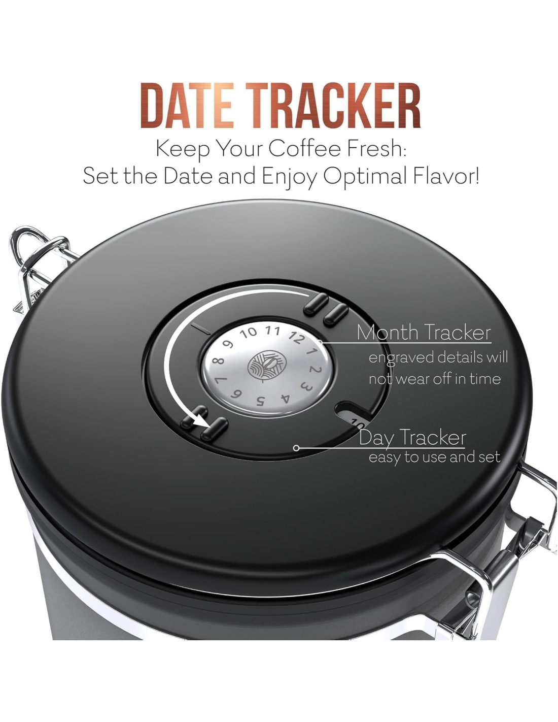 - Rastreador de Fecha Integrado para Máxima Frescura - ¡Nunca olvides cuándo almacenaste tu café! El dial de fecha integrado te permite rastrear el tiempo de almacenamiento, asegurando que cada preparación esté en su punto máximo de sabor.