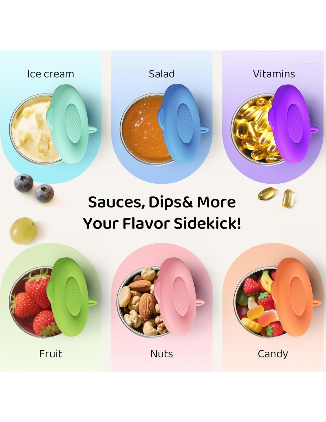 - A prueba de fugas y sello seguro: Las tapas de silicona crean una barrera hermética, evitando fugas y derrames. Lleva aderezos, salsas o dulces en tu bolsa sin sorpresas desordenadas. Consejo profesional para evitar fugas: Presiona el centro de la tapa (después de cerrar o mientras cierras) para "liberar" aire, asegurando un sello de vacío apretado.