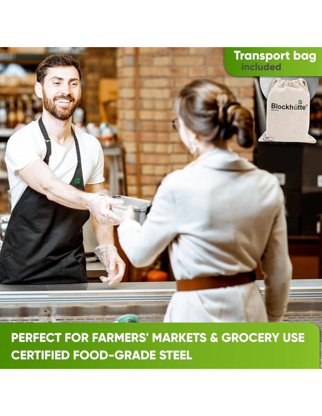Es agradable que podamos hacerte feliz con nuestra pasión en el desarrollo de productos. Nils & Malte. A menudo estábamos de viaje y en la carretera. Y no queríamos usar recipientes de plástico desechables para alimentos y bebidas, ¡necesitábamos alternativas! Desafortunadamente, no encontramos buenas soluciones con nuestros altos estándares - ¡podemos hacerlo mejor! Simple, sostenible y diseñado de manera inteligente con una calidad premium. ¡Y todo esto por una cantidad razonable de dinero! ¿Quieres apoyar a una joven startup? Con nosotros estás exactamente en el lugar correcto, porque somos una empresa familiar de Paderborn, Alemania, fundada en 2019. ¿Siempre olvidas comer a tiempo y necesitas una caja de almuerzo de acero inoxidable para tener tus comidas listas? ¿Quieres cambiar de plástico inestable a una caja de almuerzo de metal confiable, una caja de almuerzo con compartimentos para disfrutar de tus comidas? ¿Quieres una caja de almuerzo de acero inoxidable para niños o adultos que dure años? Hecha con una mezcla premium de 18% de cromo y 8% de níquel, esta caja de almuerzo de acero está construida para durar décadas. El acabado cepillado resiste el desgaste, manteniendo tu caja de almuerzo bento de acero inoxidable luciendo genial con el tiempo. Equipado con el sello de doble cámara especial de Blockhütte, tu caja de almuerzo a prueba de fugas es completamente hermética, además, ¡se incluye un sello de repuesto! Completamente libre de BPA, BPS y todos los plastificantes dañinos. Probado y certificado por DEKRA para cumplir con los máximos estándares de seguridad alimentaria. La marca oficial de vidrio y tenedor te permite llenar tu caja de almuerzo bento de acero inoxidable en mostradores de alimentos frescos. Caja de almuerzo. Tarro aislado + cuchara. Caja de almuerzo redonda + cuchara. Botella + cepillo. Taza de café para llevar. Botella + tapa. Botella deportiva + cepillo.