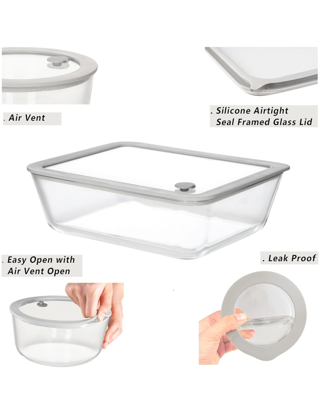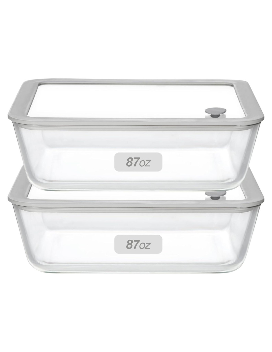 - 2 JUEGOS DE TAMAÑO EXTRA GRANDE: Cada juego viene con los contenedores de vidrio y tapas de vidrio con marco de silicona gris. 2 Paquete de tamaño rectangular: 87oz (2.6L), (20.3x25.4x8cm)