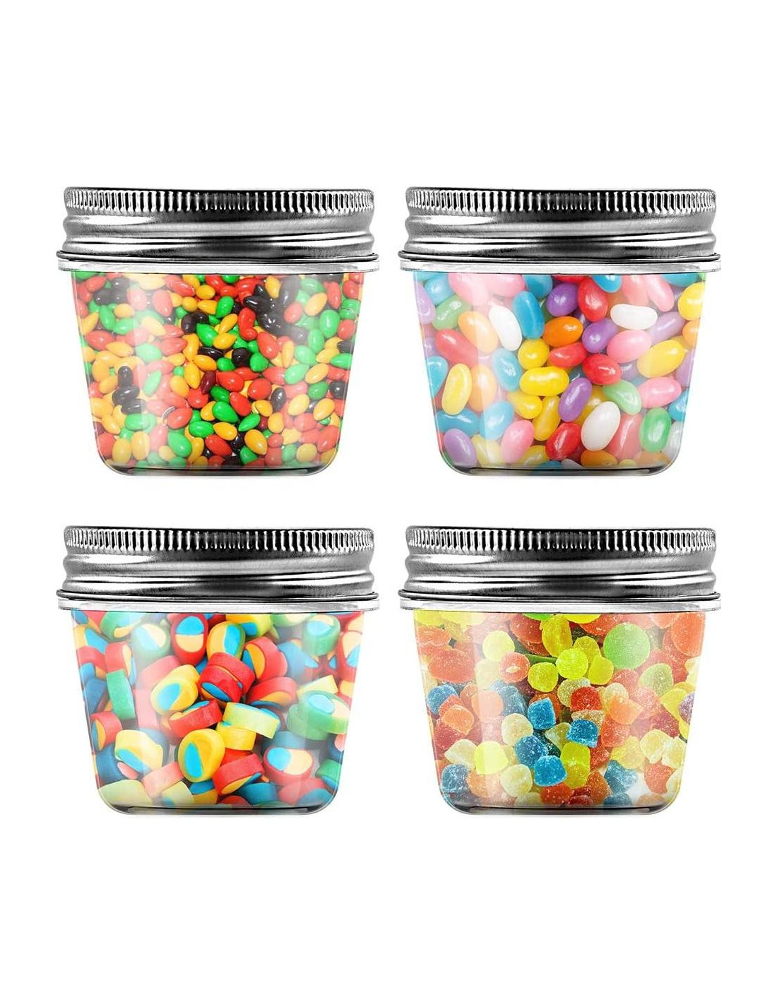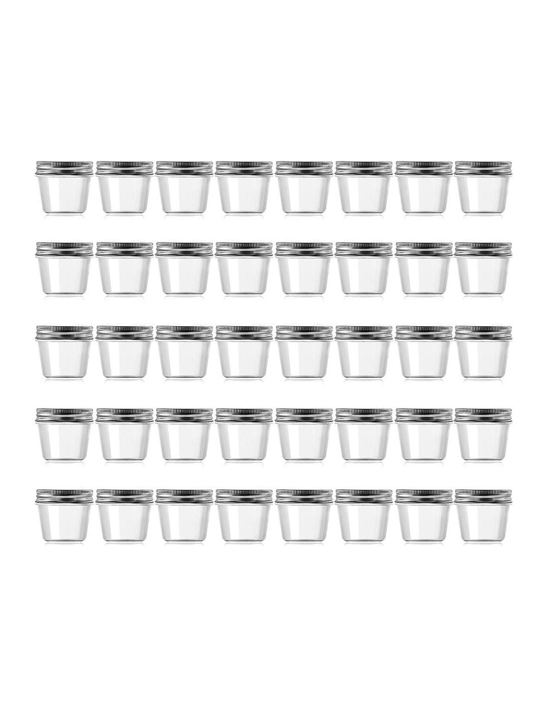 - 1. Frasco de plástico claro de 4 onzas: El paquete incluye 40 frascos de plástico claros de 4 onzas con tapas de metal plateado; el producto frasco de plástico mide 7.1 centímetros de diámetro, 6.6 centímetros de altura