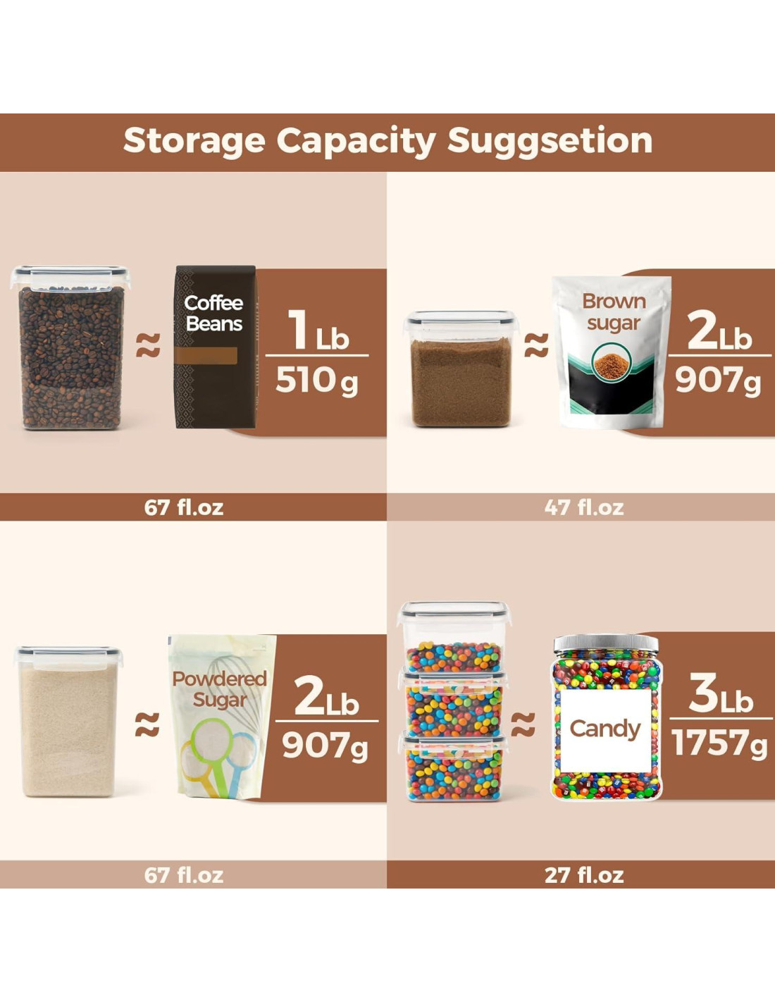 - Versátil: Puede usar el contenedor de azúcar moreno de 67 oz para 0.75 a 1.2 lb (0.34 a 0.54 kg) de cereal, granos de café o pasta; El contenedor de 47 oz y el de 27 oz son ideales para azúcar, té, caramelos, snacks, especias, nueces, o incluso frutas frescas y sándwiches en el refrigerador o para picnics