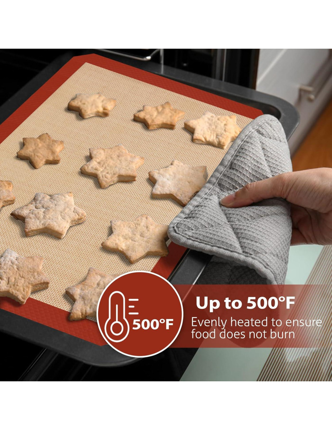 - [MATERIAL DURADERO] Las alfombrillas de silicona para hornear están hechas de silicona de grado alimenticio para ayudar a distribuir el calor de manera uniforme sobre toda la superficie de horneado. Excelente resistencia al calor y durabilidad hacen que las alfombrillas de silicona sean seguras para el horno de -40F (-40C) a 446F (230C).