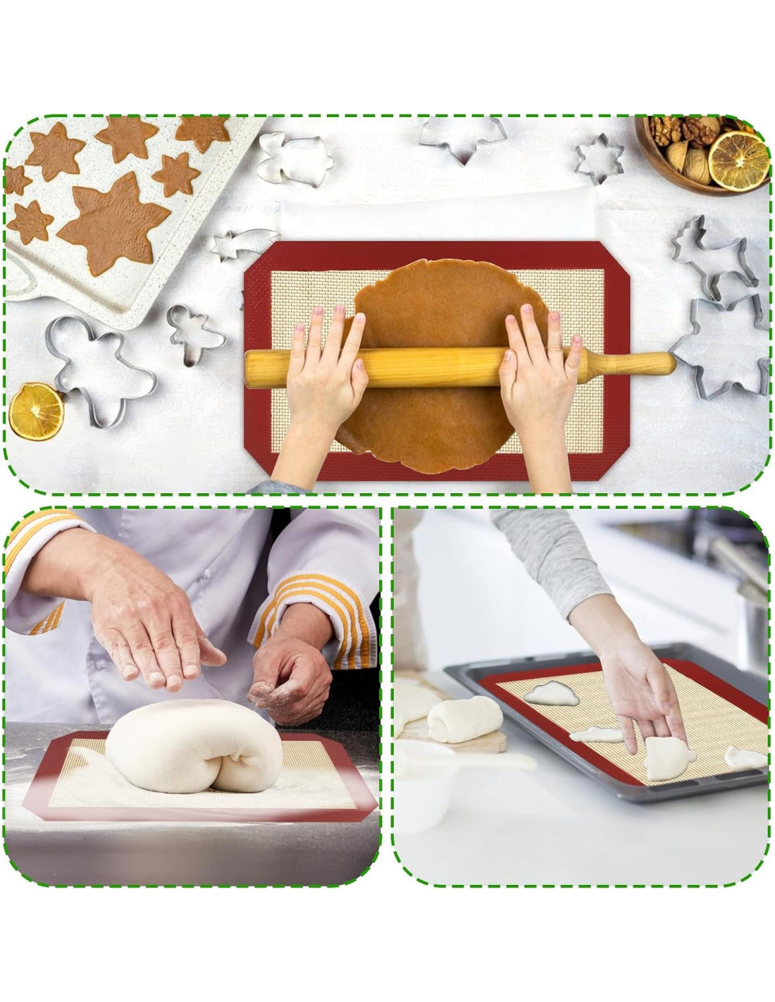 - Material de alta calidad: Estos tapetes para hornear de silicona están hechos de silicona 100% importada apta para alimentos, superficie antiadherente, incolora e inodora, reutilizable y resistente a altas temperaturas, la combinación de silicona y material de fibra de vidrio está diseñada para garantizar un rendimiento y fiabilidad duraderos, los tapetes para hornear de fibra de vidrio de silicona son fáciles de limpiar y aptos para lavavajillas.