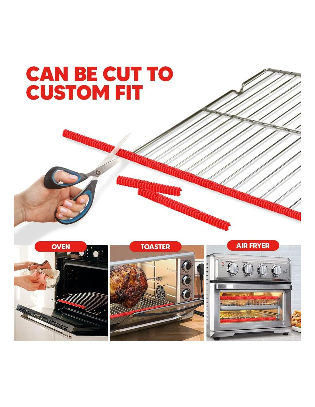 - SE PUEDE CORTAR PARA AJUSTAR HORNO MÁS PEQUEÑOS Y TOSTADORAS: Protector de horno de 22 pulgadas (55.88 cm) de largo que se adhiere fácil y seguramente al borde de cualquier estante de horno. Puedes cortarlo convenientemente para que se ajuste a tu horno de cualquier tamaño. El revestimiento de silicona se agarra en su lugar y es antideslizante. Puedes usarlo para otros electrodomésticos como tostadoras.