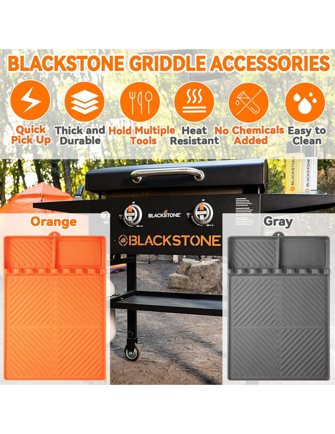 - Ampliamente Utilizado: Nuestra alfombrilla de herramientas para estante lateral es resistente al calor y puede funcionar de manera segura durante mucho tiempo. Se aplica a un amplio rango, no solo es un accesorio esencial para la plancha Blackstone, sino también el mejor compañero de accesorios de BBQ para parrillas de ahumador, parrillas eléctricas y parrillas de carbón.