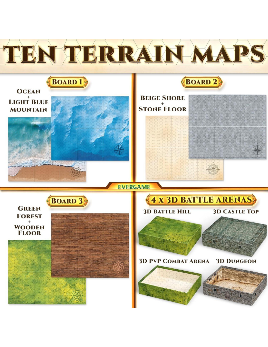 - INCLUYE MÁS QUE CUALQUIERA - 3 Tableros de juego de doble cara con 6 enormes terrenos únicos plegables de 22x26" (Hex Grid); Cuatro arenas de batalla 3D (Cima del Castillo, Mazmorras, Colina de Batalla y Arena de Combate PvP); 5 Hojas completas de 140+ stickers de acción reutilizables que incluyen - props, efectos de hechizos, paisajismo y vehículos, 4 Marcadores coloridos con cabezas borradoras y 1 Borrador de tamaño completo
