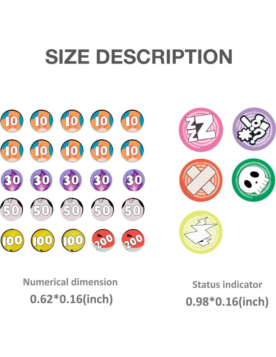 - 31 Contadores de Daño y Fichas: Cada tapete incluye 31 contadores de daño que mejoran la flexibilidad del juego. Estos contadores también funcionan como fichas, asegurando una gestión fluida de los estados de batalla.