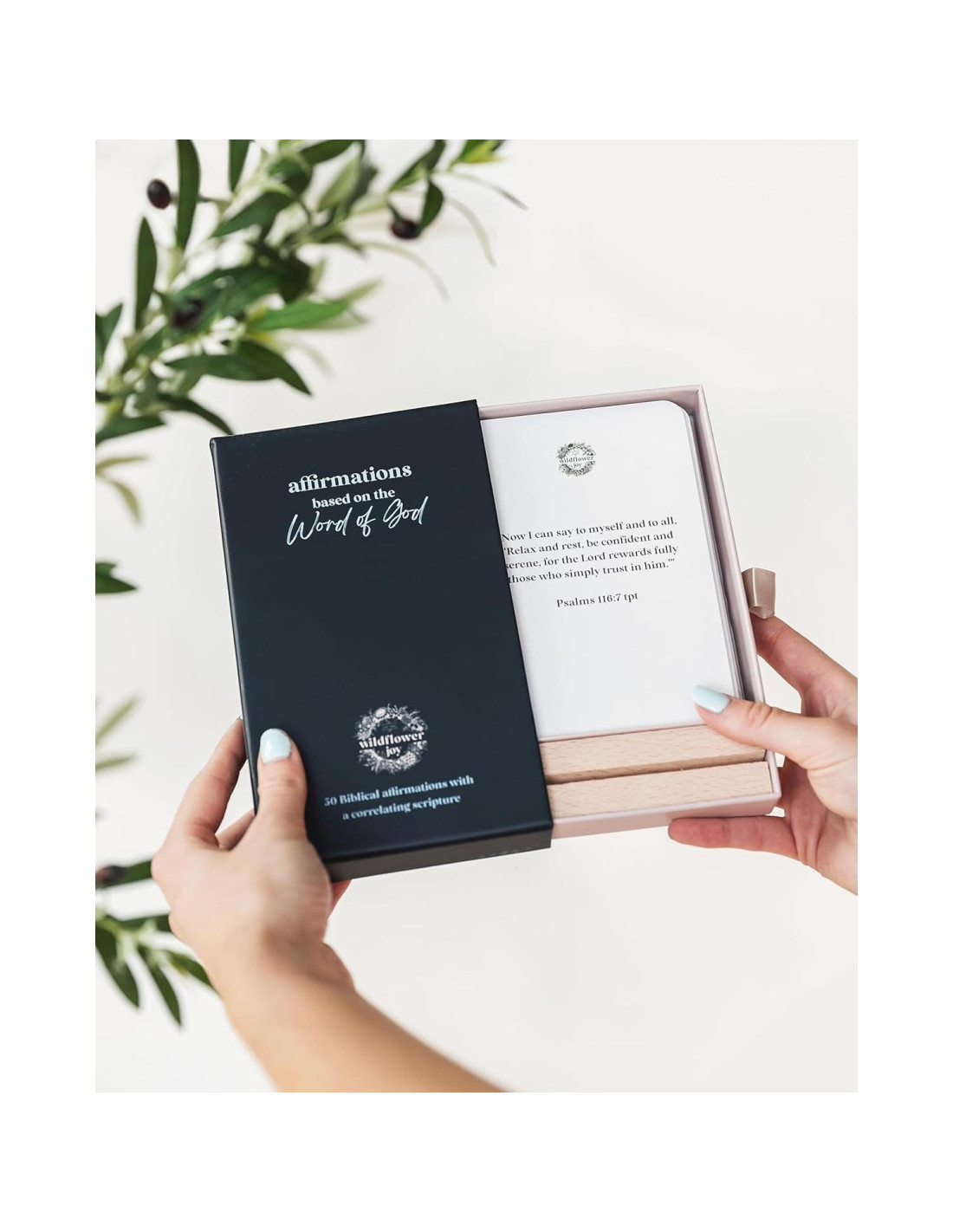 - Exhibe Tus Tarjetas de Afirmaciones - Esto incluye 50 tarjetas, un soporte de exhibición de madera y una caja de almacenamiento. Elige una nueva tarjeta cada día o semana y colócala en tu soporte donde la verás a menudo para recordarlo. Por ejemplo, en tu mesita de noche, encimera de cocina, baño o oficina.