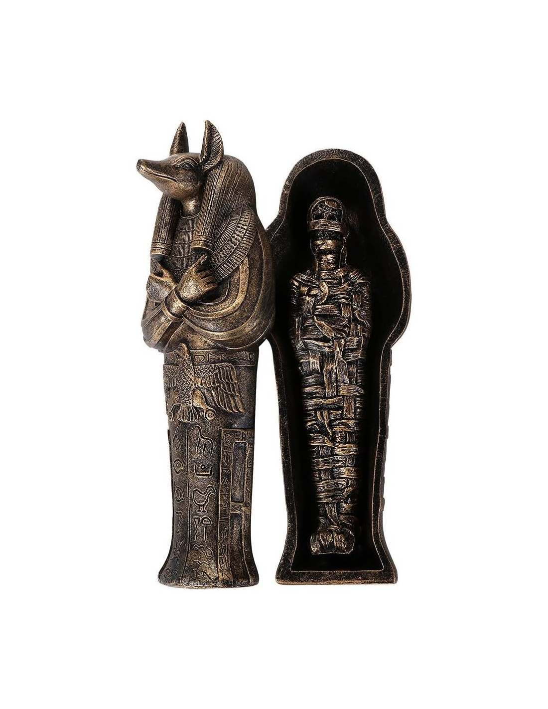 Artefacto egipcio coleccionable que presenta el sarcófago del Dios del Inframundo Anubis con una figura de momia insertada. Hecho de resina de alta calidad y pintado a mano individualmente