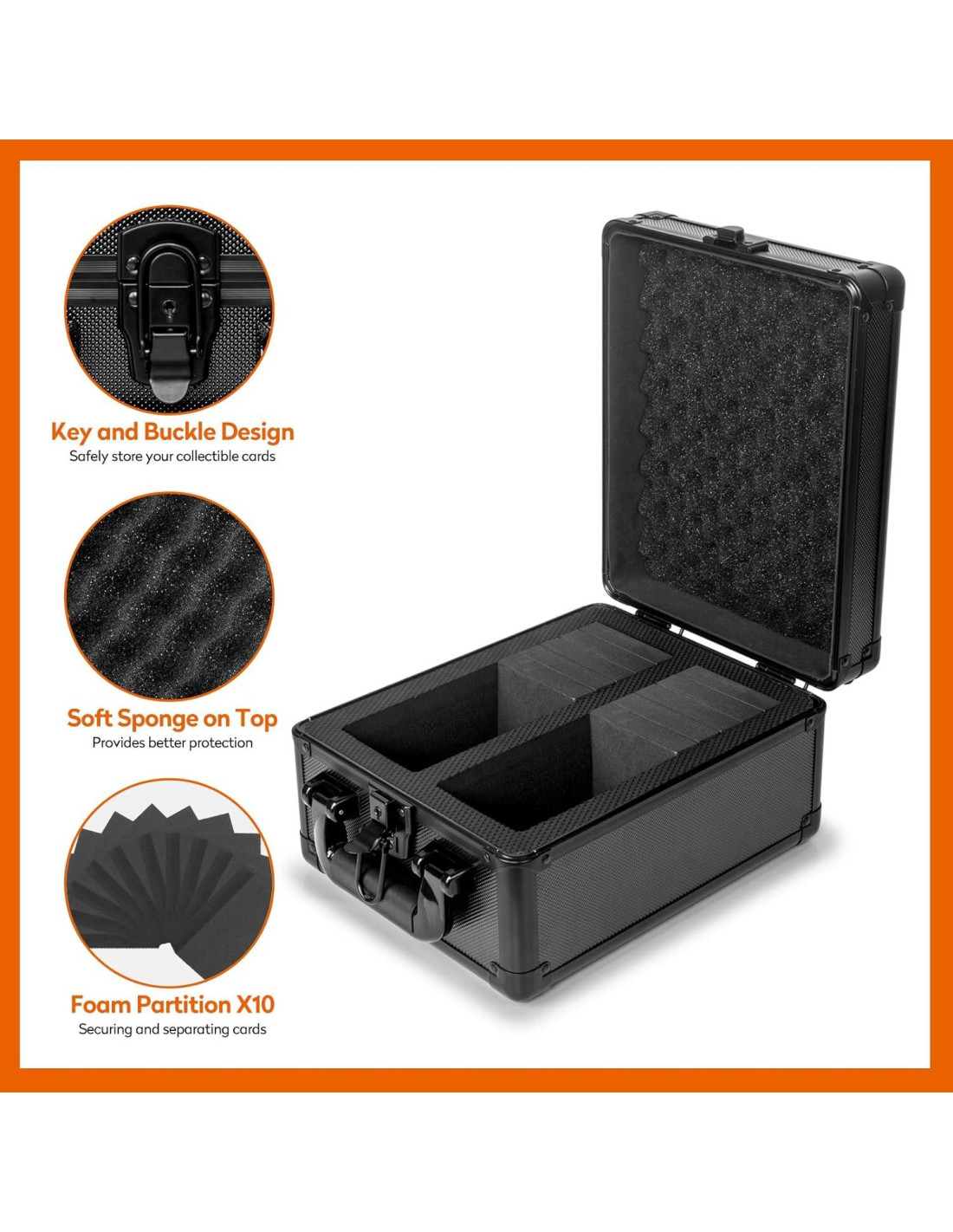 - Materiales de Alta Calidad: El marco de nuestra caja de almacenamiento para tarjetas de béisbol está hecho de aleación de aluminio, la superficie de la placa está cubierta con un acabado ABS duradero, y el interior está forrado con material EVA, con un total de 2 ranuras para tarjetas. Cada ranura para tarjetas también está equipada con 5 esponjas suaves, que tienen un buen rendimiento a prueba de golpes, a prueba de polvo y a prueba de humedad para garantizar que las tarjetas estén seguras e intactas. El tamaño de una ranura para tarjetas es 207mm*108mm*83mm