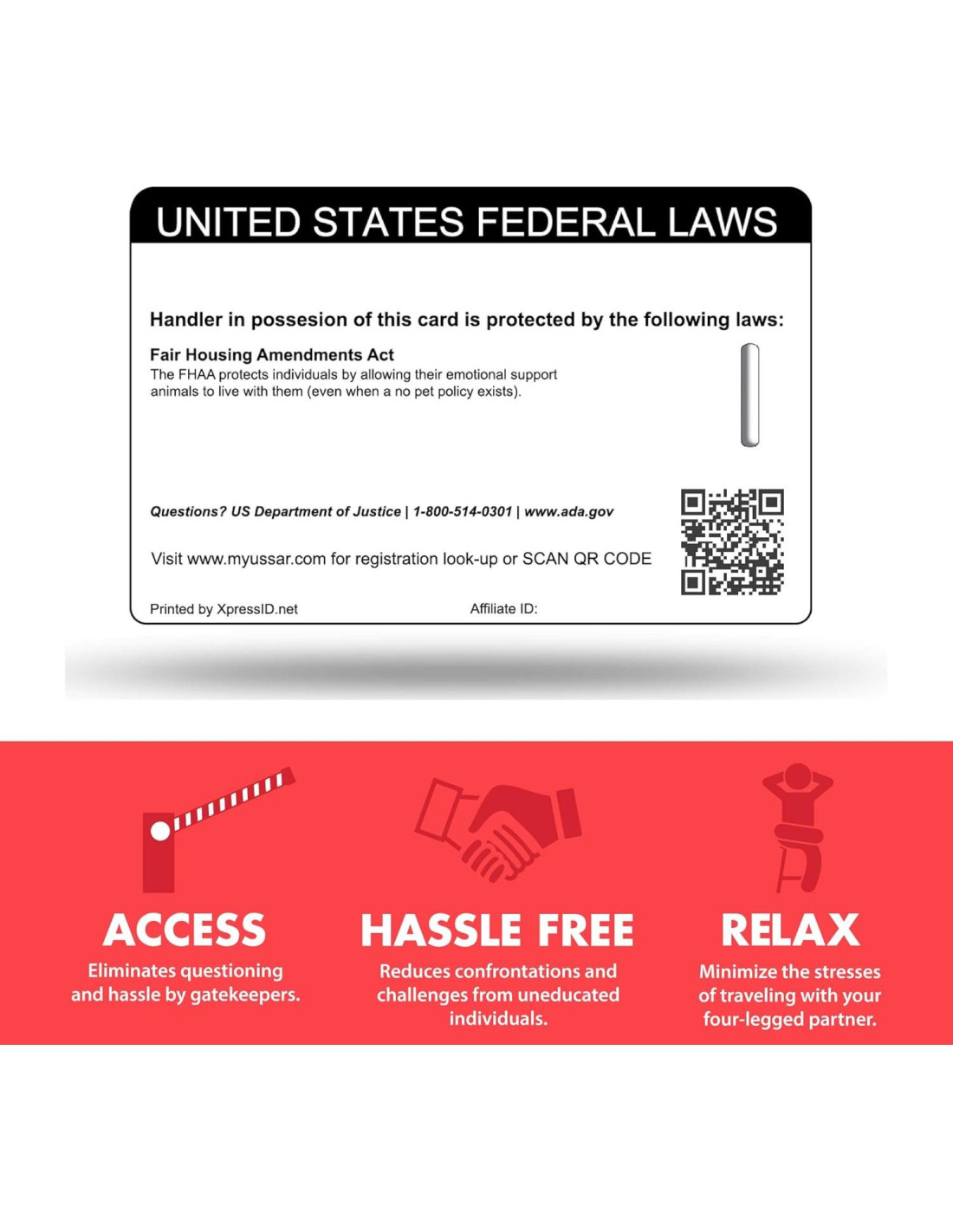 - REGISTRO en el Registro de Animales de Servicio de EE. UU. con su compra. El registro se realiza simultáneamente al ingresar la información de su perro y manejador en nuestro formulario en línea. LISTO PARA CÓDIGO QR: Un código QR único está impreso en el reverso de la tarjeta de PVC, cuando se escanea redirigirá a la página de perfil del manejador y del perro en nuestro sitio de registro.