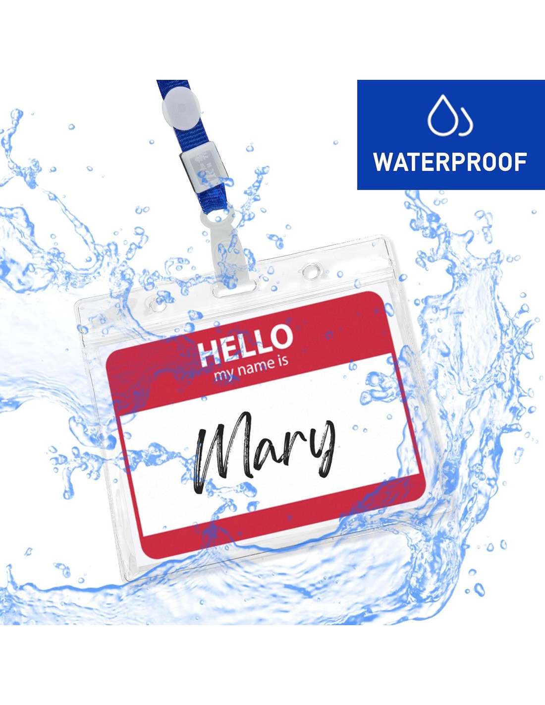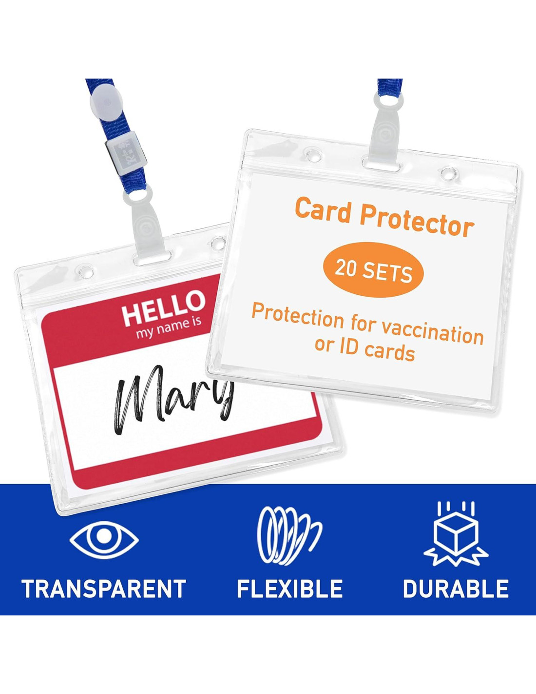 JUEGO DE 20 SUJETADORES DE TARJETAS DE IDENTIFICACIÓN CON CINTAS: Almacena y exhibe de forma segura etiquetas de nombre, tarjetas de identificación, pases de visitante y más con nuestros sujetadores de tarjetas de nombre transparentes y cintas. Una forma sencilla de mantener documentos esenciales seguros, protegidos y fácilmente accesibles siempre que los necesites, estos sujetadores de identificación de plástico transparente están diseñados para sostener tarjetas de identificación horizontales que miden hasta 4.25 x 3.5 (10.8 x 8.9 cm), y se suministran con cintas de poliéster convenientes. El sujetador de etiquetas de nombre transparente está hecho de PVC duradero, que es lo suficientemente resistente para el uso diario y asegura que el protector de tarjeta de identificación de plástico se mantenga impecable y libre de rasgaduras, desgarros y pliegues, incluso cuando se pliega o se lleva en los bolsillos de forma regular. Cada funda de etiqueta de nombre es impermeable y a prueba de polvo para mantener tu tarjeta de identificación limpia, seca y segura, y la funda de plástico transparente de la tarjeta de identificación horizontal se puede abrir y volver a sellar rápida y fácilmente para la extracción y reemplazo con una parte superior de cremallera de plástico. Las cintas de poliéster azules son rápidas y fáciles de adjuntar a los sujetadores de etiquetas de nombre y son cómodas de llevar alrededor del cuello, además de permitir que las identificaciones de oficina o médicas sean vistas y escaneadas sin ser retiradas. Alternativamente, una opción de agujeros y ranuras a lo largo de la parte superior permite que los sujetadores de insignias se adjunten a un llavero o se aseguren a un clip de mosquetón. Este conveniente y versátil protector de tarjeta de 4.25 x 3.5 (10.8 x 8.9 cm) es adecuado para una variedad de tarjetas, desde tarjetas de vacunación del CDC hasta pases de autobús o tren, identificaciones laborales, llaves electrónicas de habitación, tarjetas de membresía e incluso etiquetas de equipaje. También están disponibles otros tamaños de cubierta de tarjeta de identificación con cinta.