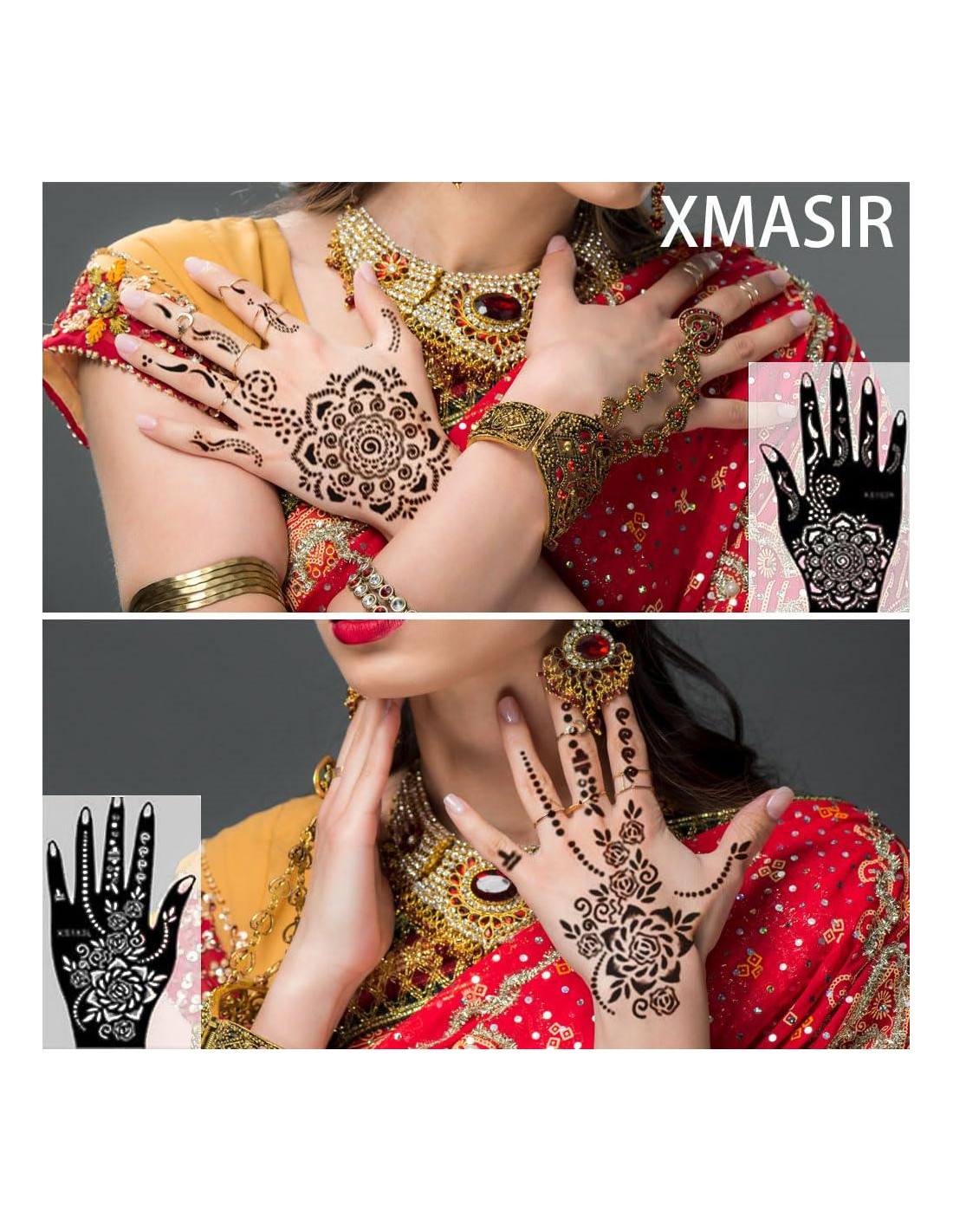 "Sé tú mismo" es nuestro concepto de marca. Comenzamos en 2018, Xmasir ofrece una variedad de diseños y patrones de Stickers y Plantillas de Tatuajes Temporales. Y siempre nos comprometemos a proporcionar a los clientes productos de alta calidad y rentables. Método de uso: 1.Lava la piel con jabón, seca la piel. 2.Retira la plantilla de tatuaje, pégala en la piel. 3.Retira la película protectora. 4.Corta la pasta de tatuaje de henna en la parte superior de 3-5mm. 5.Aplica la pasta de tatuaje de henna en el área hueca de la plantilla. 6.Espera de 30 a 60 minutos, esperando a que la pasta de tatuaje se solidifique. 7.Retira la plantilla de tatuaje, limpia la pasta, el resultado final. Consejos: 1.Utiliza las plantillas también para Tatuajes de Jugo y Tatuajes con Aerógrafo. 2.Agrega brillo con un pincel para un efecto especial. 3.Perfecto para Tatuajes de Henna y Tatuajes de Jugo. 4.Adecuado para Cumpleaños, Graduaciones, Fiestas, Eventos Laborales, Regalos, etc. Nota: 1.La plantilla es una plantilla completa. Si la posición no es adecuada, puedes cortarla con tijeras y pegarla en la posición que deseas usar. Por favor, ten cuidado de no dañar el diseño. 2.El paquete solo contiene plantillas, excluyendo crema de henna, botella de henna, tatuaje de jugo, brillo, etc.
