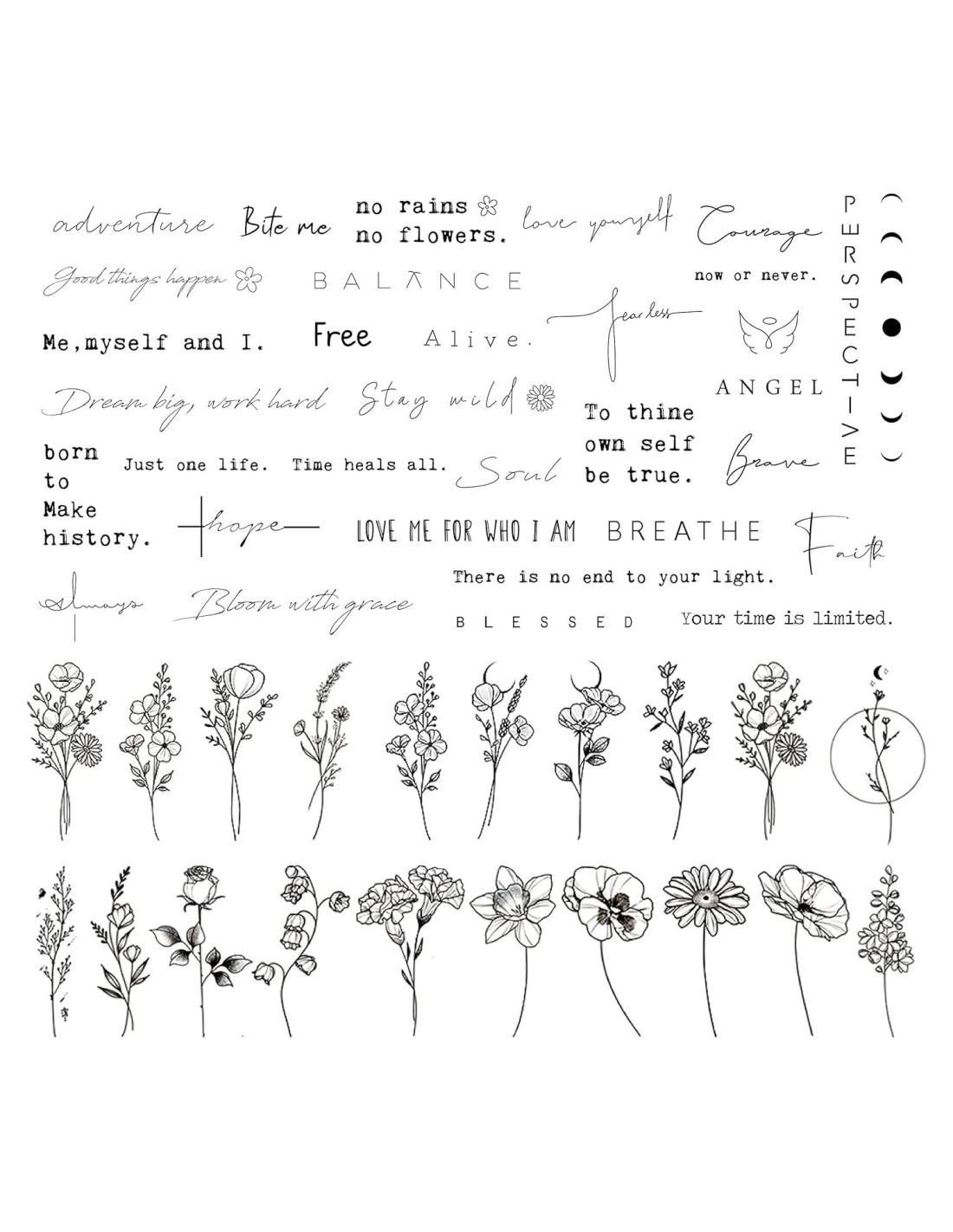 - Tamaño y diseño: Cada hoja mide 10x6 cm (3.9"X2.3"). 60 hojas de tatuajes temporales falsos minimalistas semi permanentes impermeables para hombres y mujeres. Colección de tatuajes significativos que incluye citas motivacionales, palabras, frases y tatuajes de flores de nacimiento.