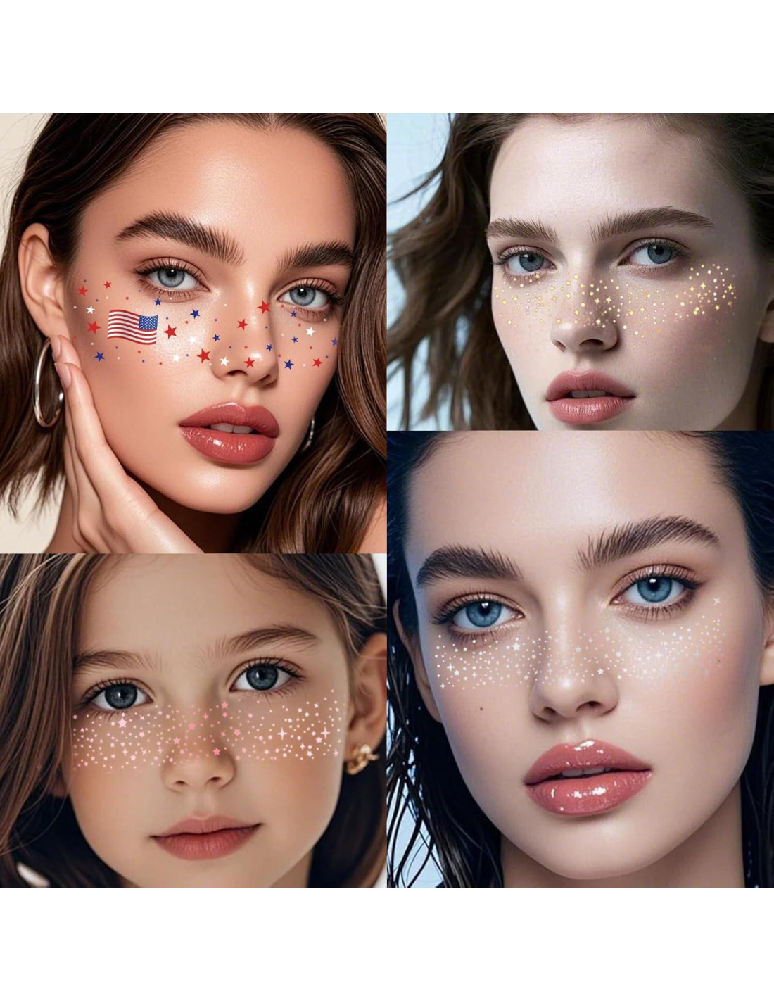 - Elige tu tatuaje temporal de pecas: Nuestros tatuajes temporales están disponibles en 4 sets. Cada set de pegatinas de pecas incluye 10 pegatinas de pecas, donde cada set es un estilo y color único. Las pegatinas de pecas en plata, oro y oro rosa tienen una textura de papel de aluminio metálico y están diseñadas para que brilles en cada momento para el maquillaje diario y temático. Y una pegatina de pecas en rojo, blanco y azul está diseñada para el Día de la Independencia del 4 de julio.