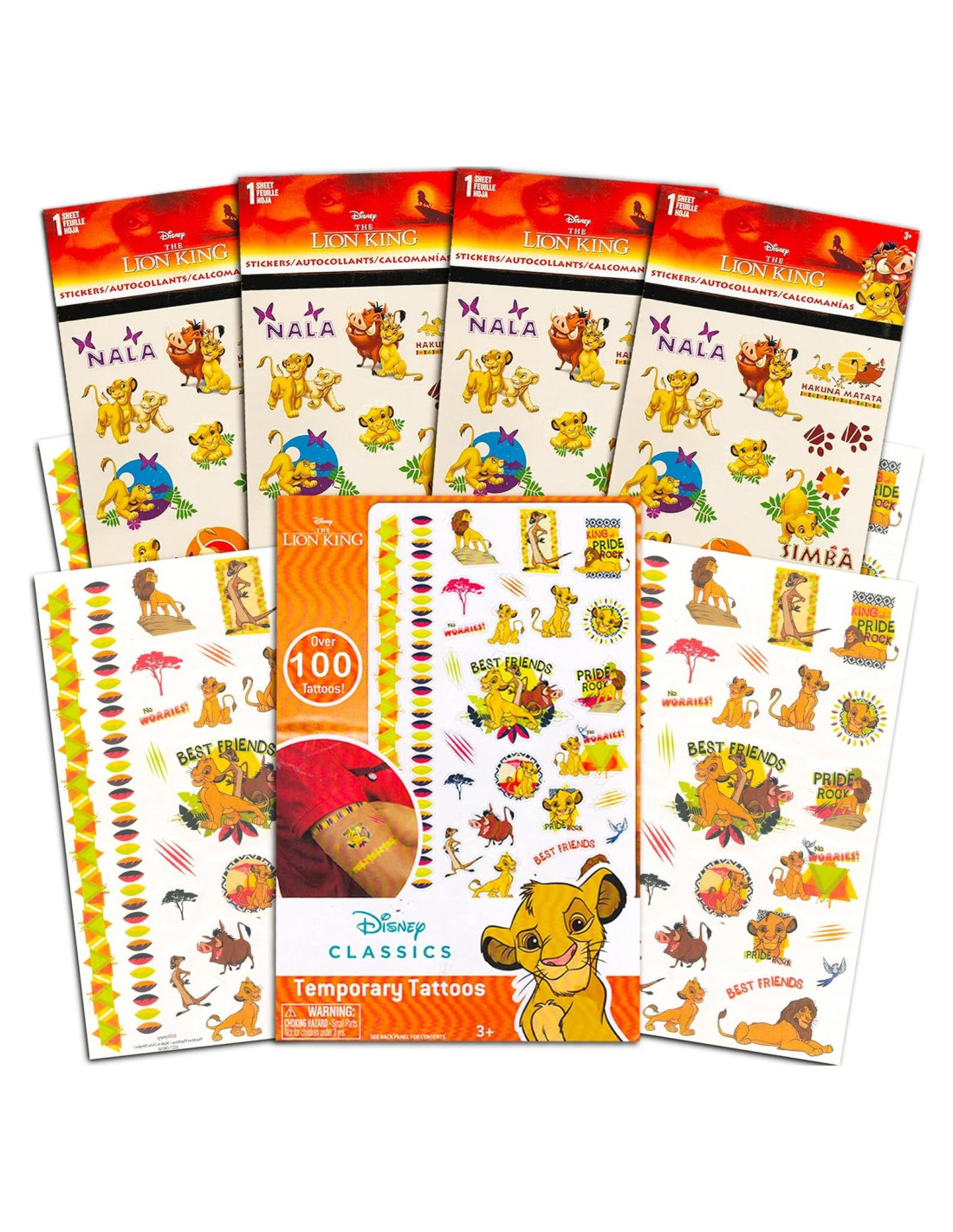 - Incluye 100 tatuajes temporales del Rey León -- 4 hojas de tatuajes. Los tatuajes temporales del Rey León son divertidos, rápidos de aplicar y fáciles de quitar. Ingredientes aprobados por FD&C. La actividad perfecta para la fiesta del Rey León.
