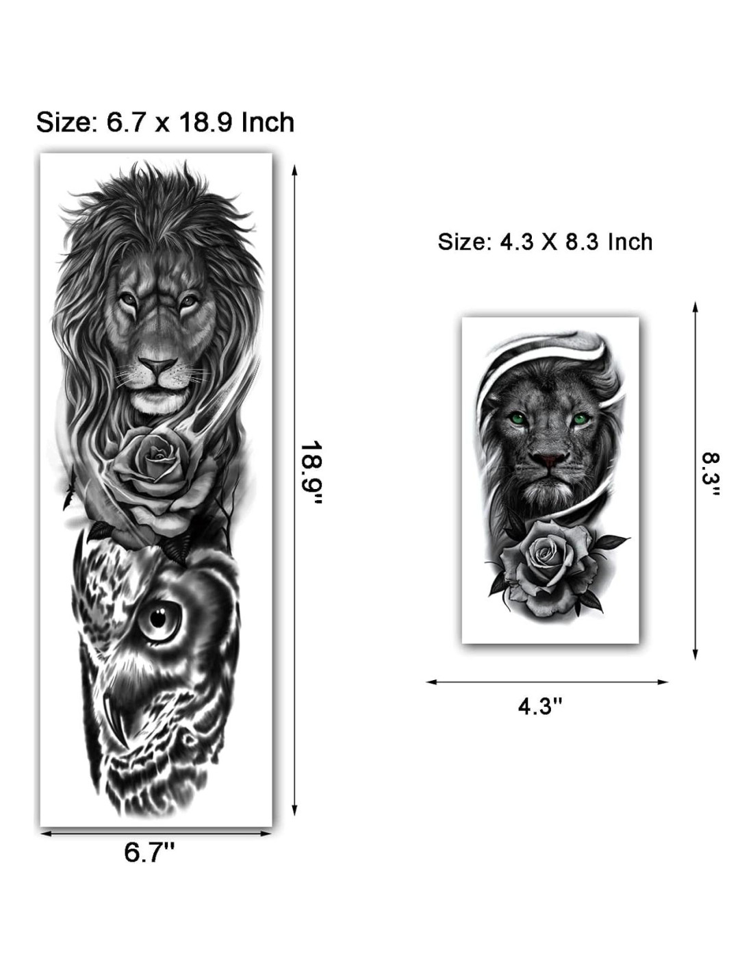 - Diseños Detallados de León y Tigre::-- Este conjunto incluye 9 hojas de tatuajes temporales de brazo completo y media manga, con poderosos y realistas diseños de león, tigre y cruz, perfectos para cualquier evento, desde cosplay hasta fiestas.