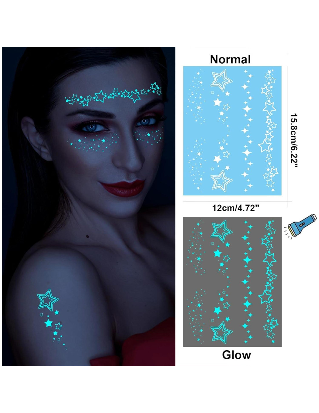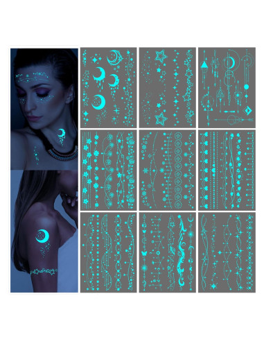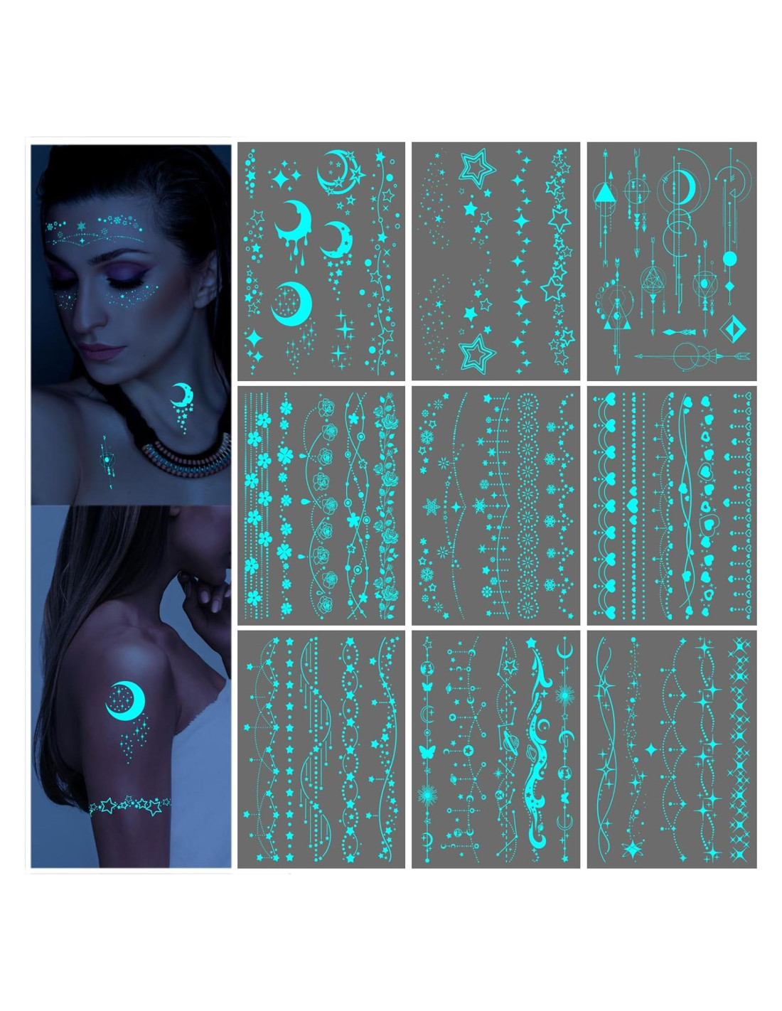 - [DURADERO Y RESISTENTE AL AGUA] Tatuajes falsos luminosos azules que parecen reales y duran de 3 a 7 días. Diseños de moda duraderos, tatuajes temporales creativos personalizados para mujeres adultas, realistas, sexys, luminosos, de luna y estrella, geometría celestial, mariposa, corazón, flor, copo de nieve, tema que brilla en la oscuridad.