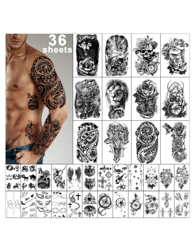 - [Tatuajes Temporales de Gran Tamaño y Gran Cantidad] Los tatuajes temporales de gran tamaño para medio brazo pueden cubrir partes de tu cuerpo más grandes, el tamaño es 9.45 * 6.69 pulgadas (24 * 17 cm) 12 hojas, 4.1 * 2.4 pulgadas (10.5 * 6 cm) 24 hojas. Puedes compartir estos tatuajes temporales para adultos con tu familia y amigos. Adecuado para fiestas, escuela, vacaciones, discotecas, playas, bodas, festivales de música, disfraces, Halloween y la vida diaria. Mezcla y combina una gran combinación de tatuajes como Tatuajes Temporales de Media Manga 3D, Tatuajes de Halloween de León, Lobo, Tigre, Calavera, Esqueleto que tus amigos pensarán que son tatuajes reales!