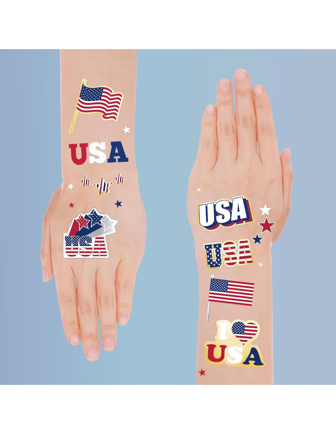 - El Accesorio Perfecto para la Fiesta: Los tatuajes temporales son perfectos para decoraciones o accesorios de fiestas del 4 de julio, suministros para fiestas, recuerdos de fiestas, decoraciones de bricolaje, etc. Se recomienda aplicarlos en tu cuerpo y cara para participar en la fiesta o reunión con temática americana. ¡Pueden aumentar la atmósfera festiva! Cada hoja mide 20.96 cm x 15.24 cm creando el tamaño perfecto para los tatuajes.