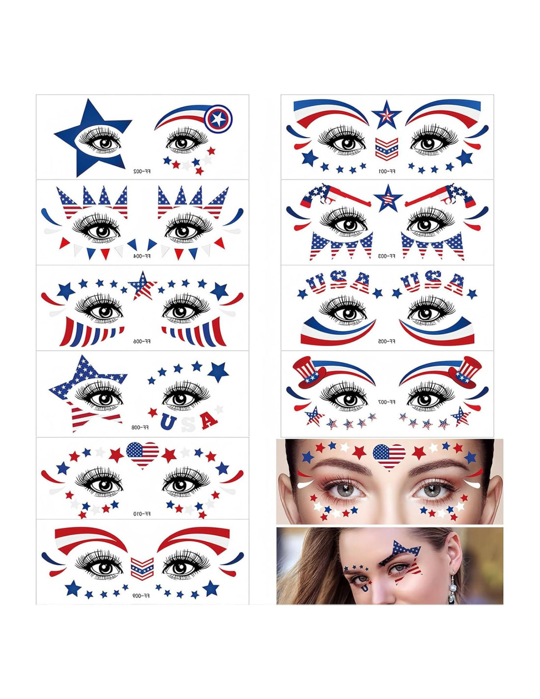- [Paquete] -- Recibirá 10 calcomanías de tatuajes faciales con temas patrióticos! Lindos y a la moda, los tatuajes temporales con temática del 4 de julio son adecuados para la decoración facial de maquillaje de ojos de niños y adultos.
