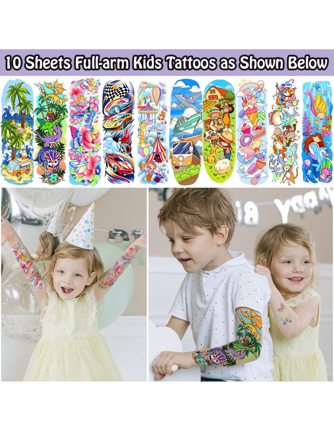 - [66 Hojas de Tatuajes Temporales de Tamaño Mixto para Niños] un paquete para obtener diferentes tamaños de mangas de tatuajes temporales para niños y niñas en cara y manos, una colección de los tipos de elementos lindos favoritos de los niños, 66 contiene 10 hojas de manga completa (27.94 * 8.89 cm), 15 hojas de manga media (11.94 * 7.11 cm), 41 hojas de pequeños tatuajes (9.66 * 6.10 cm), es una buena opción de juguete para fiestas de cumpleaños.
