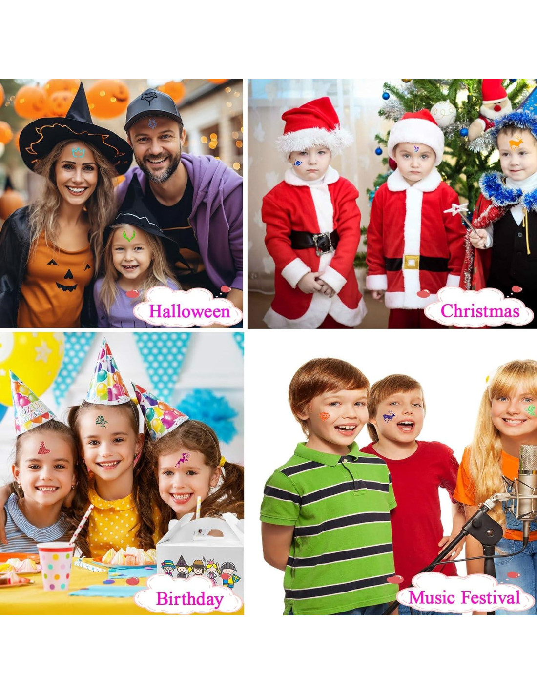 - Kit de Tatuajes de Brillo Multifuncional para Niños: Nuestro conjunto de brillo no solo es adecuado para tatuajes temporales, sino que también es bueno para pintura facial y corporal, arte de uñas DIY, manualidades, sombra de ojos, tarjetas y decoraciones. El conjunto de 48 brillos será una gran adición a cualquier colección de artes y manualidades. Simplemente libera tu imaginación para mezclar colores en diversas ocasiones como juegos DIY para niños, juegos de disfraces para niñas, carnavales, festivales infantiles, Navidad, Halloween y juegos de rol.