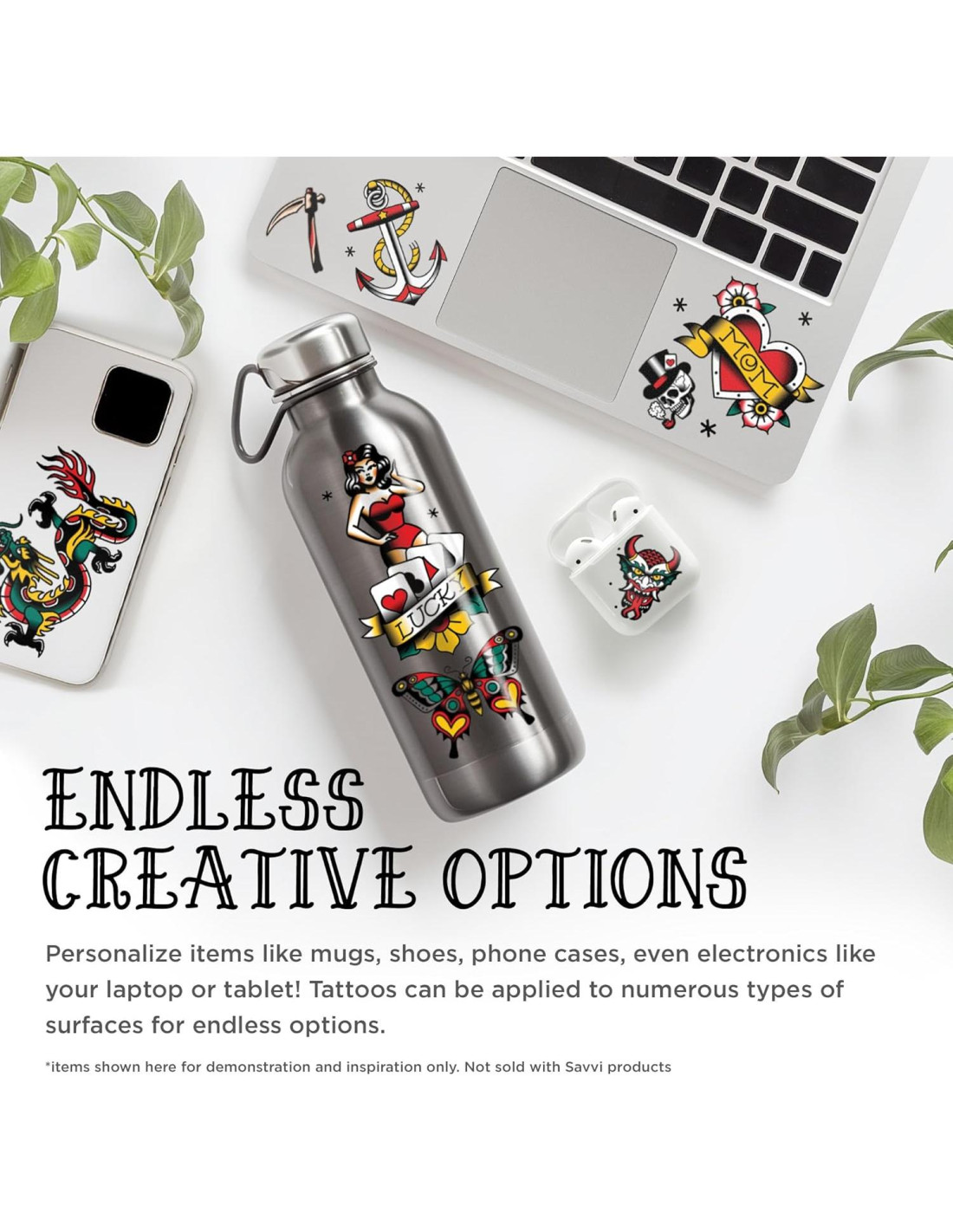 - ESTILO TRADICIONAL: Prepárate para desatar tu rebelde interior con el Paquete de Tatuajes Temporales Tradicionales Americanos de Savvi. Diviértete en un emocionante viaje de arte tradicional americano con 18 tatuajes para elegir.