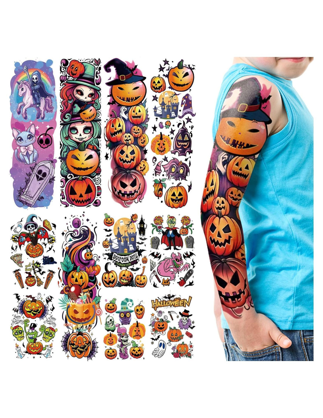 Calabaza, fantasma, castillo, monstruo, bruja, calavera, zombie... tantos diseños de patrones populares para niños. Los tatuajes temporales con el tamaño perfecto para los niños son seguros y duraderos. Es una elección perfecta para niños y niñas como regalo para fiestas de Halloween o fiestas temáticas.