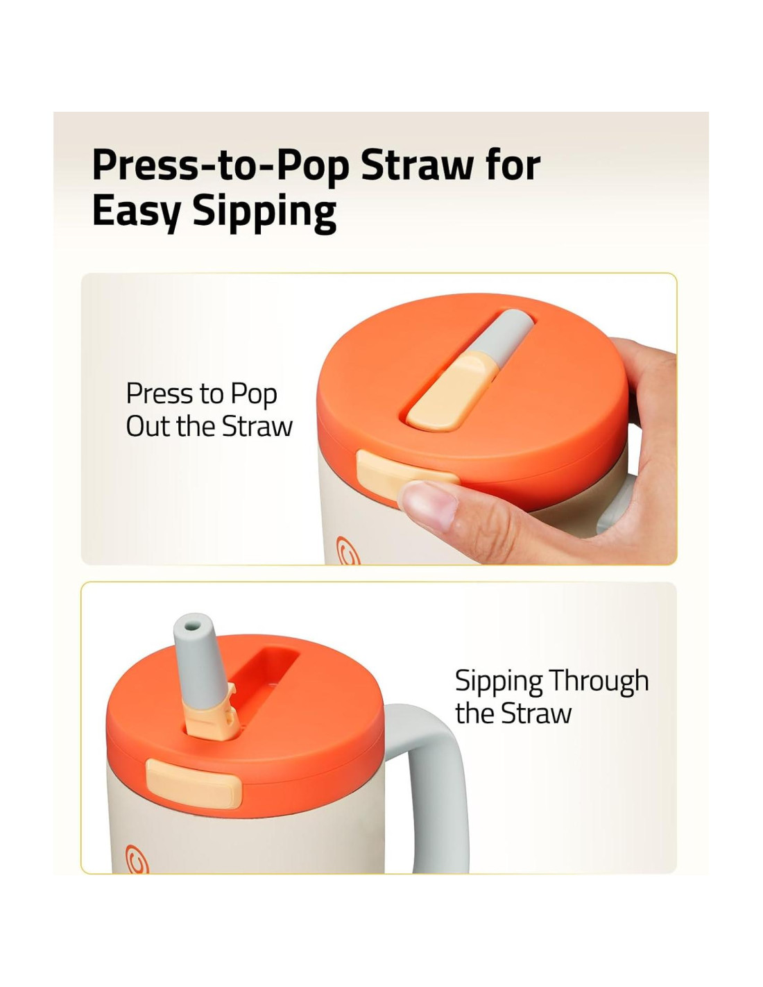 - Popote Plegable de Un Toque: El vaso aislado con popote plegable cuenta con un popote higiénico de botón que se despliega instantáneamente para beber. El popote se retrae suavemente con una simple presión para mantenerlo limpio entre usos